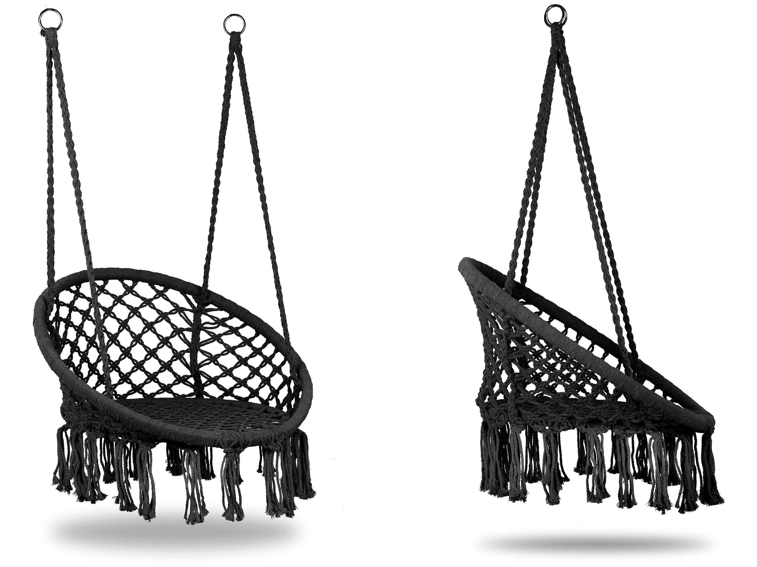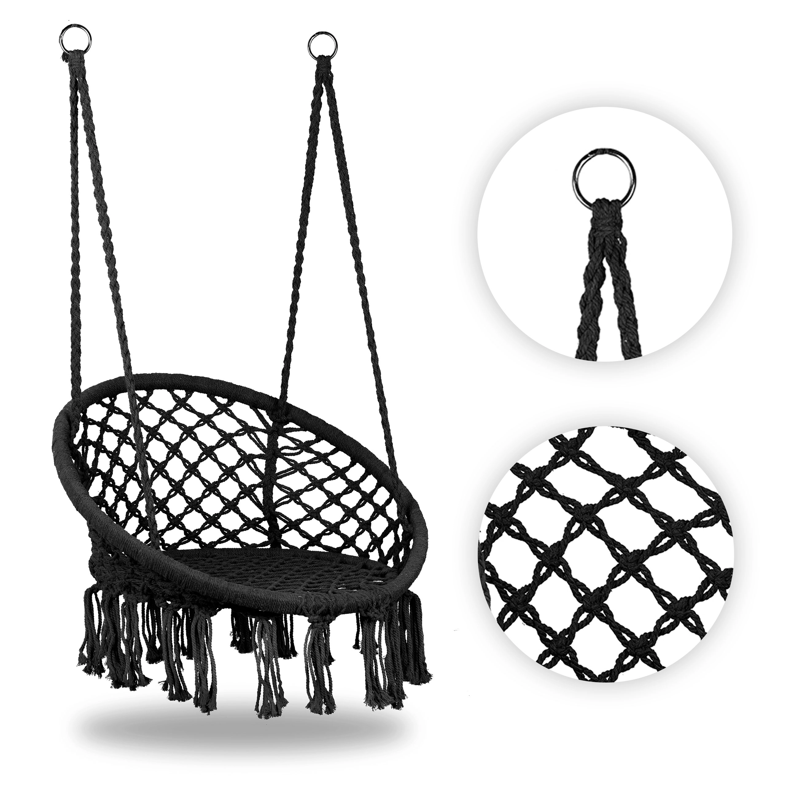 Hængestolen i boho-stil bringer en behagelig rolig atmosfære til både inde- og udemiljø. Det luftige macramé-look med frynser virker elegant og samtidig hyggeligt – det perfekte sted til morgenkaffe, læsning og aftenafslapning. Takket være de solide ophængsringe kan den nemt fastgøres til loftkrog, bjælke eller stativ.