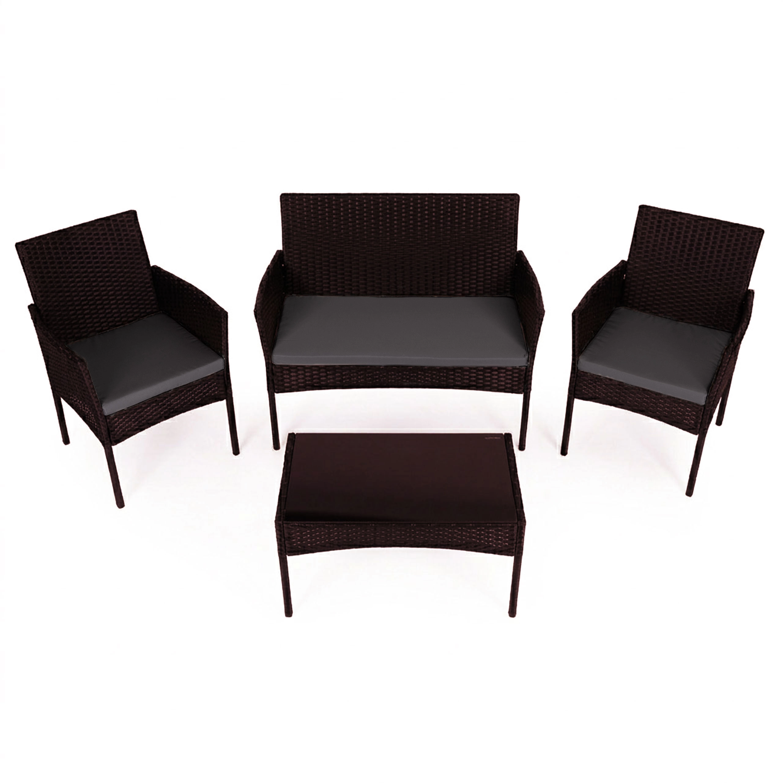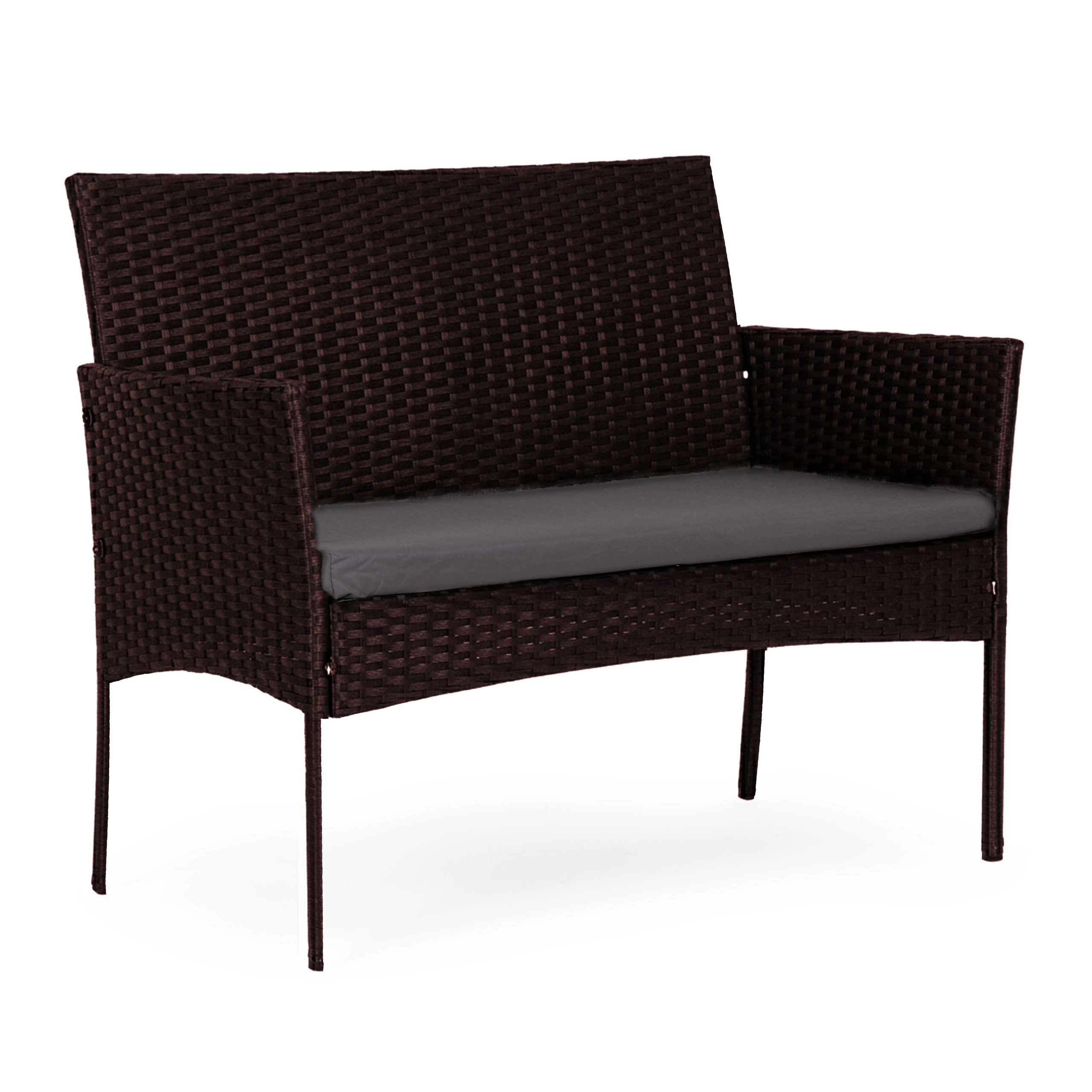 Skab en behagelig afslapningszone på terrassen eller i haven med et stilfuldt sæt til 4 personer. Sættet indeholder 2 lænestole, en bænk og et sofabord med en bordplade af hærdet glas. Den robuste konstruktion af stål og polyrattan klarer omskifteligt vejr, mens puder i polyester 160 g/m² sikrer komfort. Møblerne er nemme at vedligeholde og stabile takket være skrid sikre fodpropper på benene.