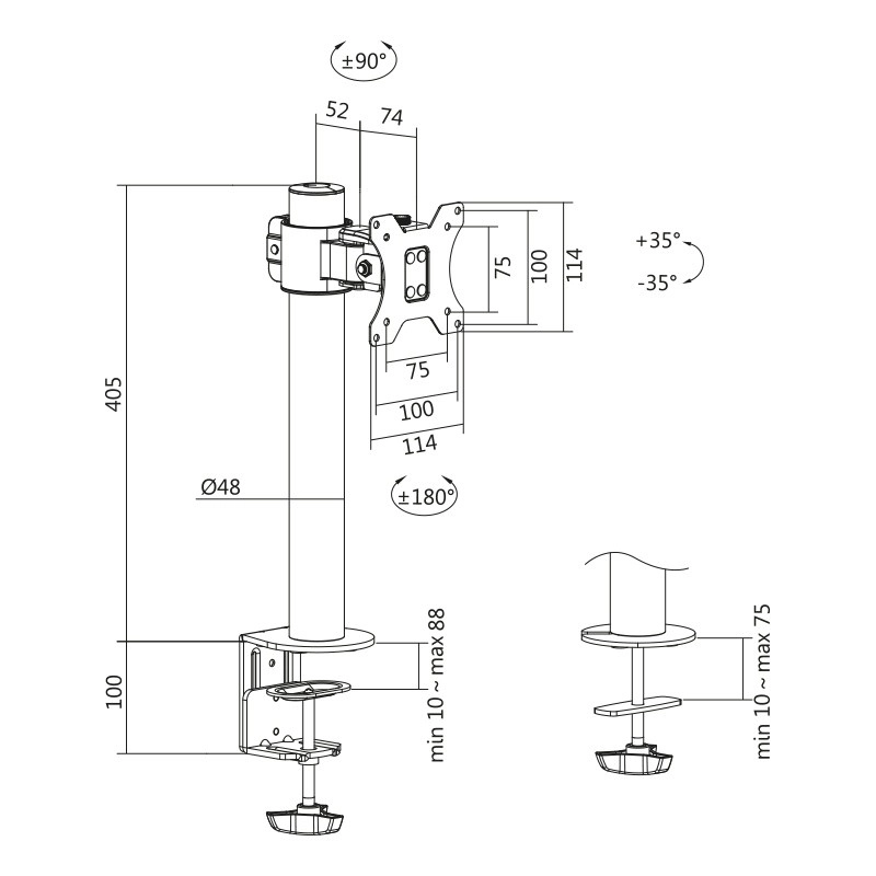 Bordholder til monitorer med diagonaler 17–32" giver stabil støtte og fleksibel indstilling. Den solide stålsøjle og VESA-kompatibilitet sikrer sikker montering, mens den leddelte arm muliggør vip, rotation og vertikal pivot til arbejde i højformat. Montering er nem med C-klemme eller gennemføring.
