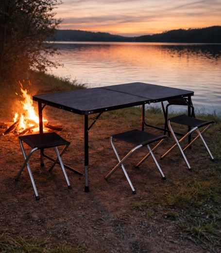 Sammenklappeligt camping-sæt: bord og 4 skamler i kuffert, sort