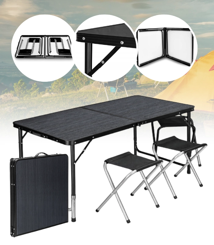 Praktisk sammenklappeligt camping-sæt med rummeligt bord og fire skamler i en kompakt kuffert er ideelt til camping, picnic, have og fiskeri. Det tilbyder hurtig opsætning, let transport takket være håndtaget og justerbar bordhøjde for maksimal komfort. Den holdbare kombination af metalkonstruktion og robust overflade sikrer stabilitet og lang levetid i ethvert terræn.