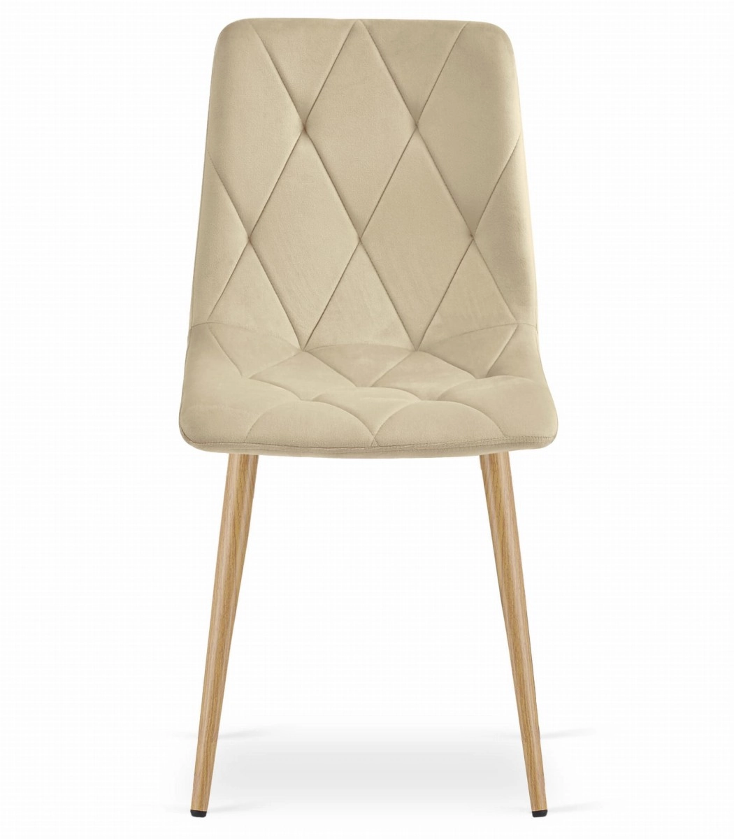 Denne beige fløjlsstol kombinerer komfort og moderne udtryk. Den bløde polstring med fløjlseffekt er behagelig at røre ved, mens den rombeformede quiltning tilfører et luksuriøst præg. Takket være det ergonomisk formede ryglæn giver den behagelig rygstøtte ved daglig brug i spisestuen eller stuen.