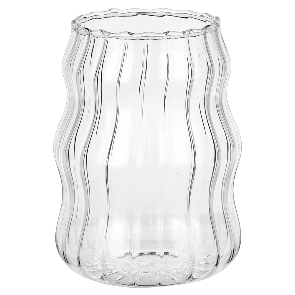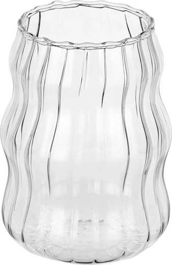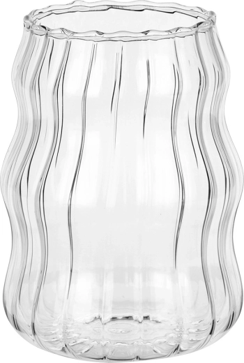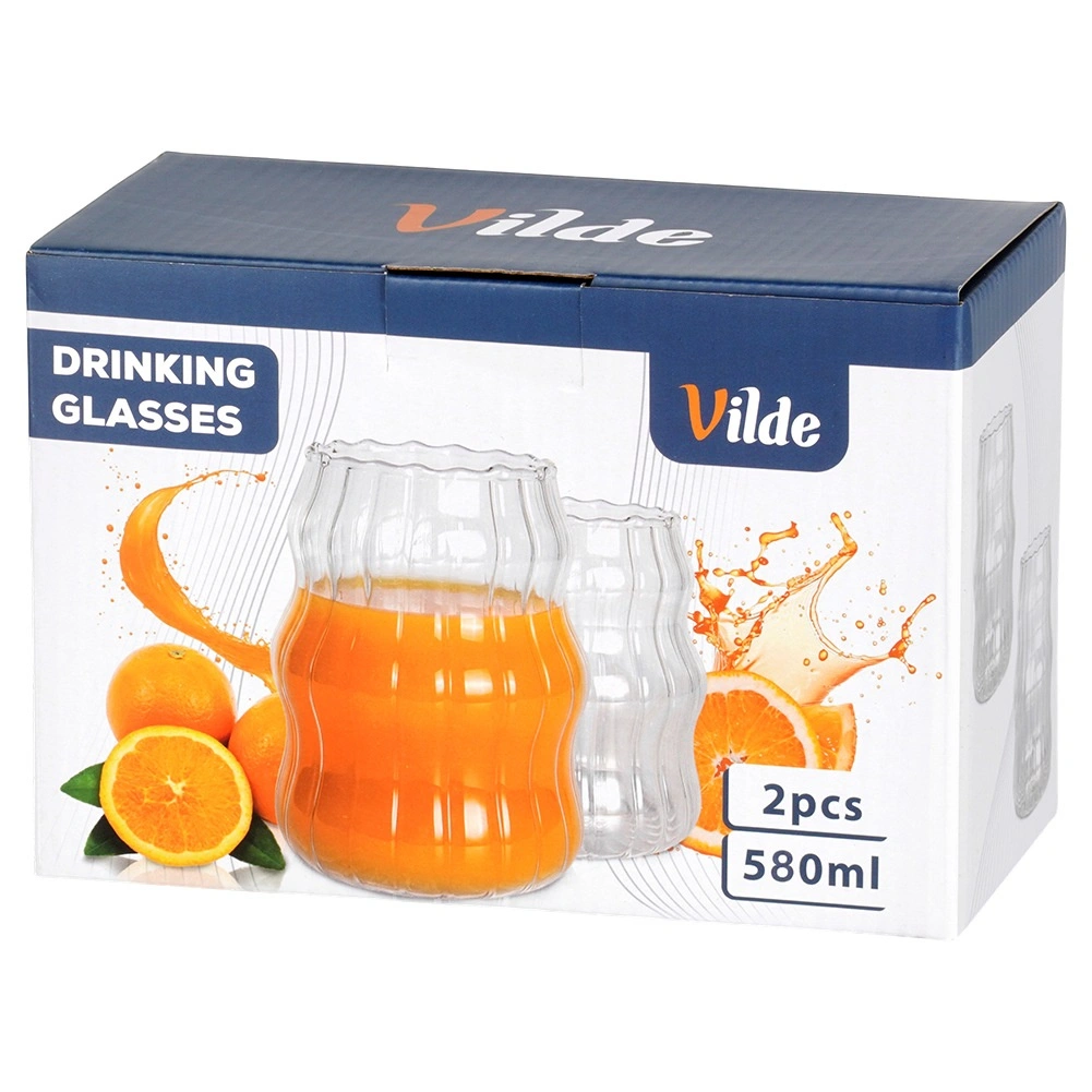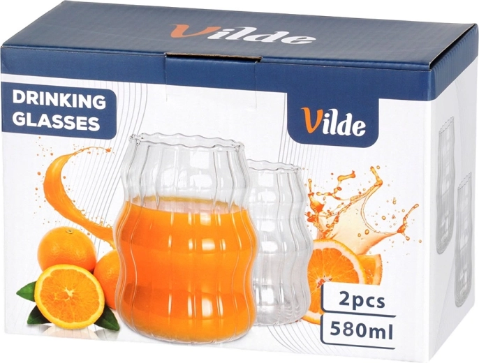 Stilfuldt sæt med to glas på 580 ml af holdbart borosilikatglas. Takket være den bølgede form og de lodrette riller ligger de godt i hånden og fremhæver drikken smukt. Velegnet til kolde og varme drikke, tåler -20 °C til +120 °C, kan vaskes i opvaskemaskine og bruges i mikrobølgeovn.