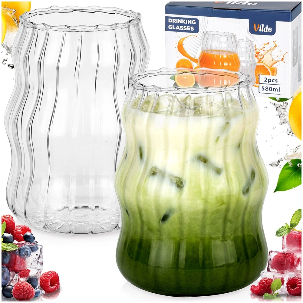 Oplev alsidige glas, der kombinerer moderne design og praktisk anvendelse. Det gennemsigtige borosilikatglas fremhæver drikkenes farver, uanset om det er lemonade med is, iste, kaffe, matcha latte eller frisk juice. Den store kapacitet på 580 ml gør dem også velegnede til drikke med isterninger og frugt.