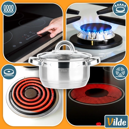 Kasserollen i rustfrit stål er kompatibel med gas-, elektriske, keramiske, halogen- og induktionskogeplader.