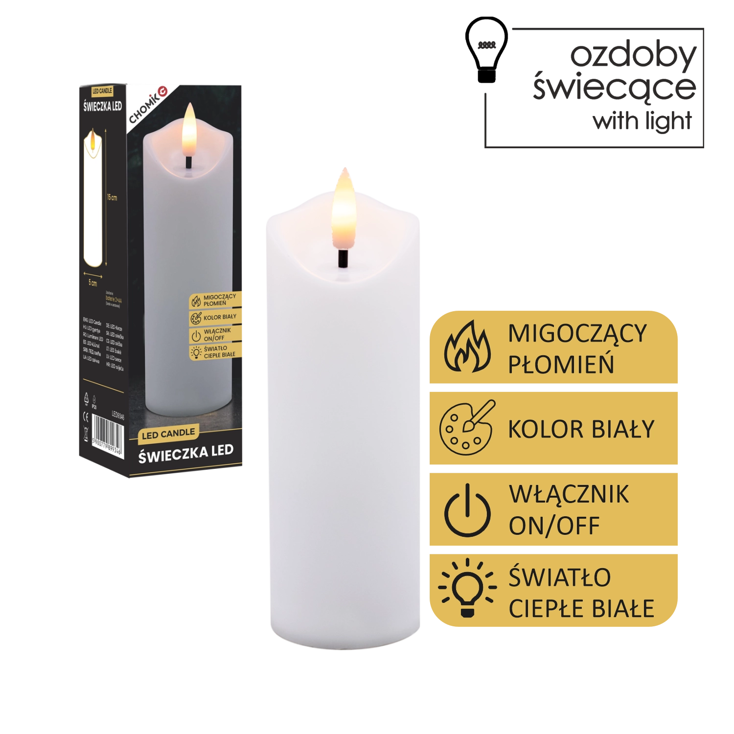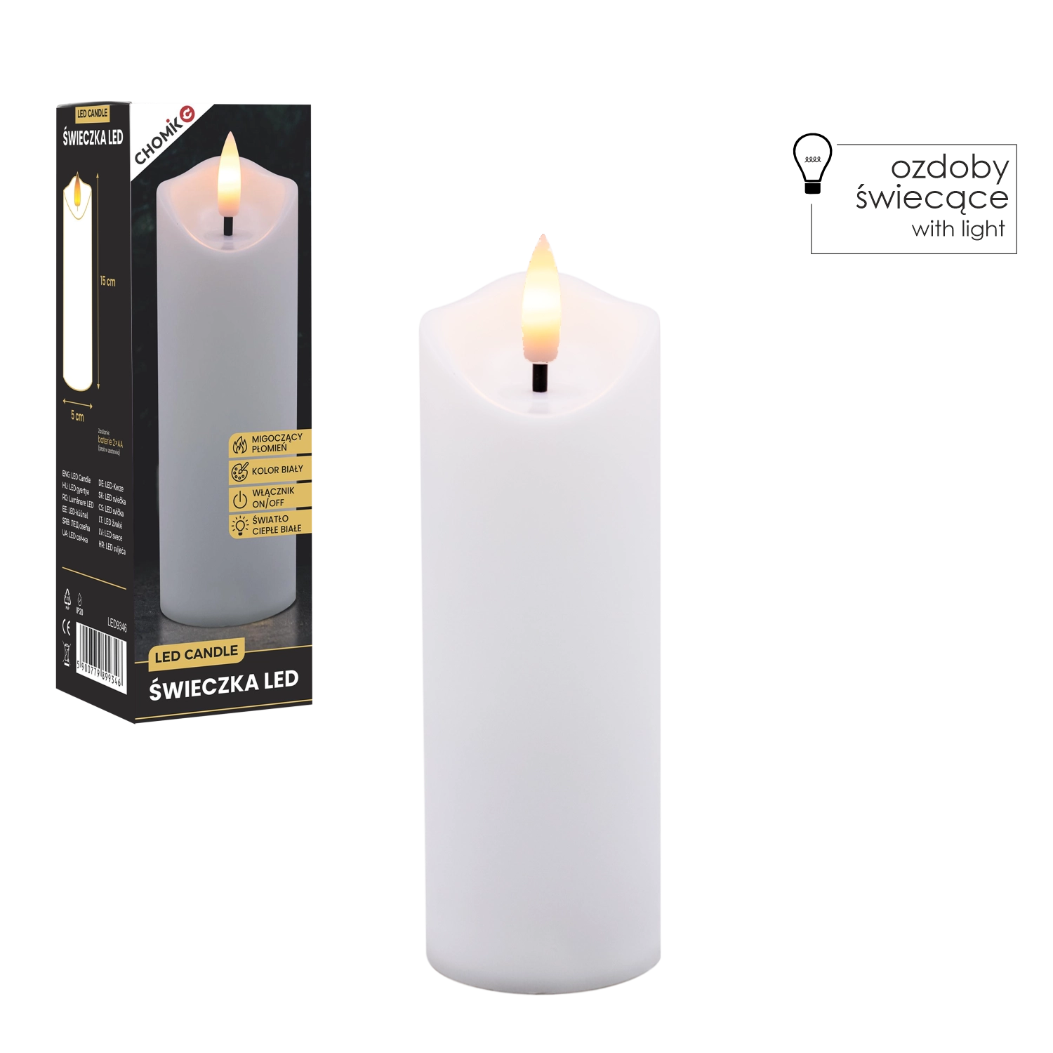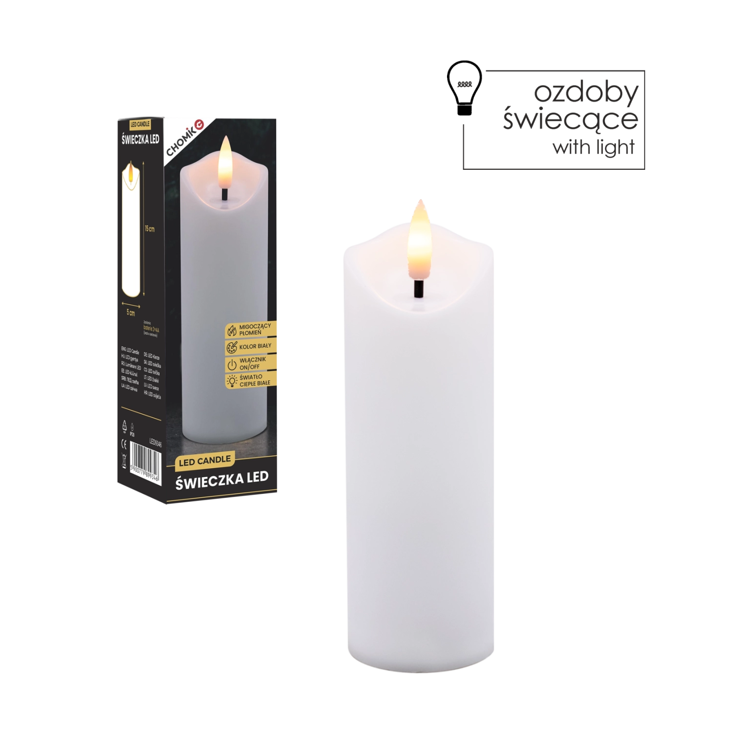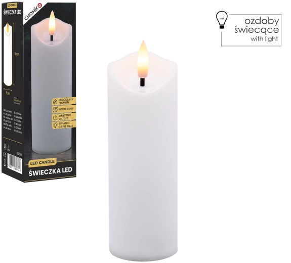 Dekorativt LED-lys i størrelsen 5 × 15 cm med en varm hvid, flimrende flamme, som skaber en hyggelig atmosfære uden røg og sod. Velegnet som indsats til lanterne/gravlys og som stilfuld indretningsdekoration. Drives af 2× AA-batterier (medfølger ikke) og har enkel On/Off-betjening.