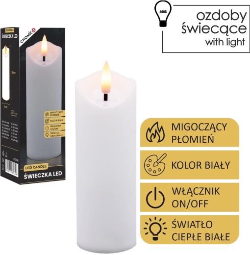 Sikkert og praktisk LED-lys i elegant hvid, der giver et behageligt, varmt lys med effekt af en ægte flamme. Ideelt til stue, soveværelse og som diskret lysdekoration på bord eller hylde. Kan også bruges som erstatning for en klassisk indsats til lanterne/gravlys.
