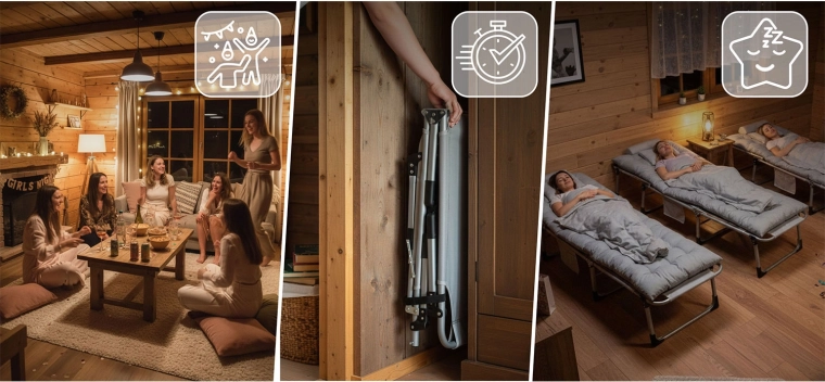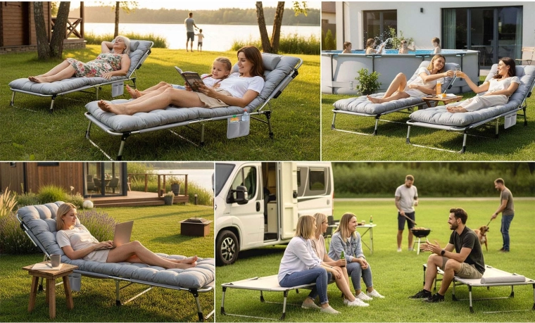 Robust metalramme, skridsikre fødder og hurtig sammenklapning. Når den er klappet sammen, er liggestolen kompakt, sikret med stropper og opbevaret i bæretaske.