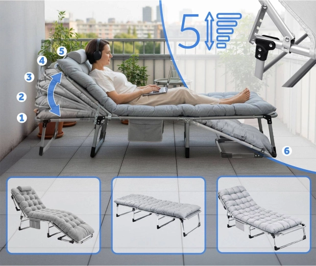Nyd komforten derhjemme og på farten med den sammenklappelige liggestol ChillWell Dream. Den tilbyder 5 niveauer af justerbart ryglæn, nedklappelig fodsektion, tykt polstret madras og pude inkluderet samt en stabil metalramme. Ideel til camping, have, terrasse og som ekstra seng til gæster – nem at folde ud, klappe sammen og bære, inklusive en praktisk taske.
