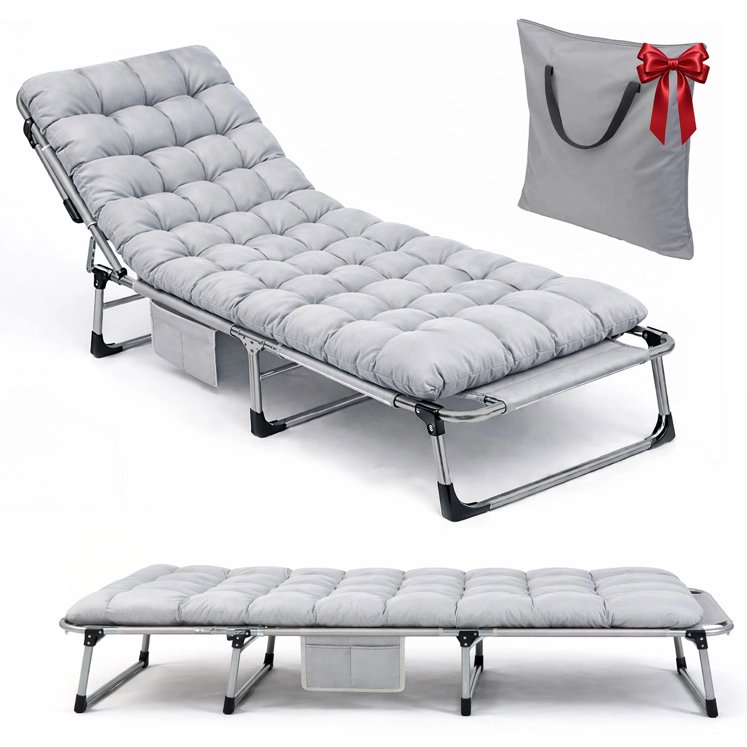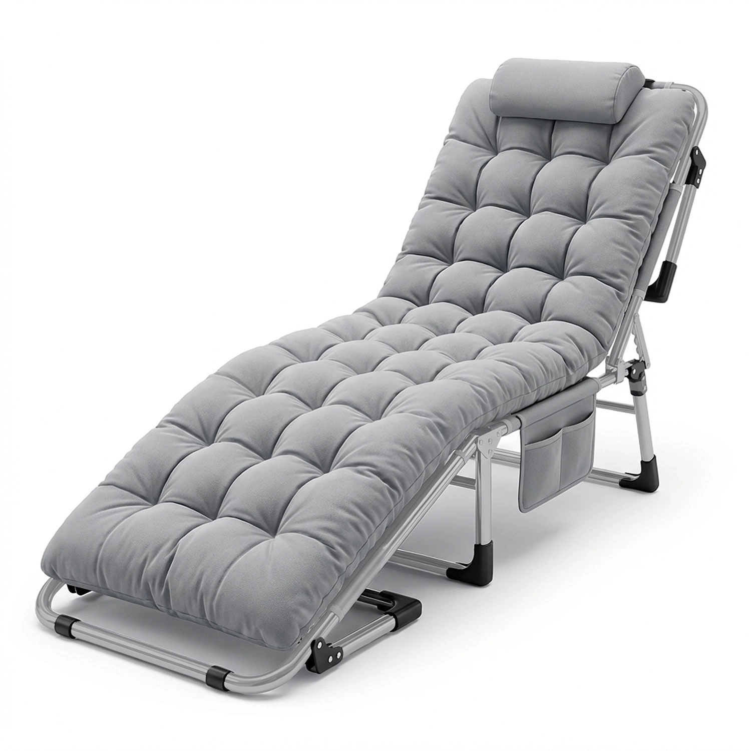 Takket være metalrammen og skridsikre fodkapper er liggestolen stabil og holdbar til udendørs brug. Den tykke, bløde madras med nakkepude forbliver luftig og komfortabel selv ved hyppig brug. En praktisk sidetaske holder telefon, bog eller flaske inden for rækkevidde. Når den er klappet sammen, er liggestolen kompakt, sikret med velcrostropper og lagt i transporttaske.