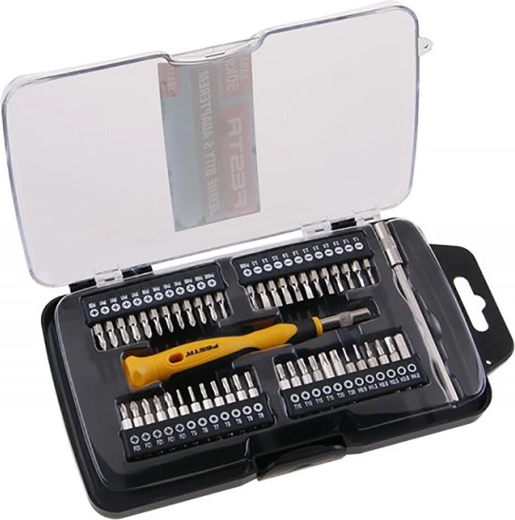 Det universelle bitsæt med adaptor FESTA indeholder 50 dele til hurtig og præcis skruning derhjemme og i værkstedet. Det kvalitetsstærke materiale CrV (chrom-vanadium) sikrer høj holdbarhed, lang levetid og pålidelig kraftoverførsel. Et ideelt valg for både gør-det-selv-folk og professionelle, der søger en kompakt og praktisk løsning i én pakke.