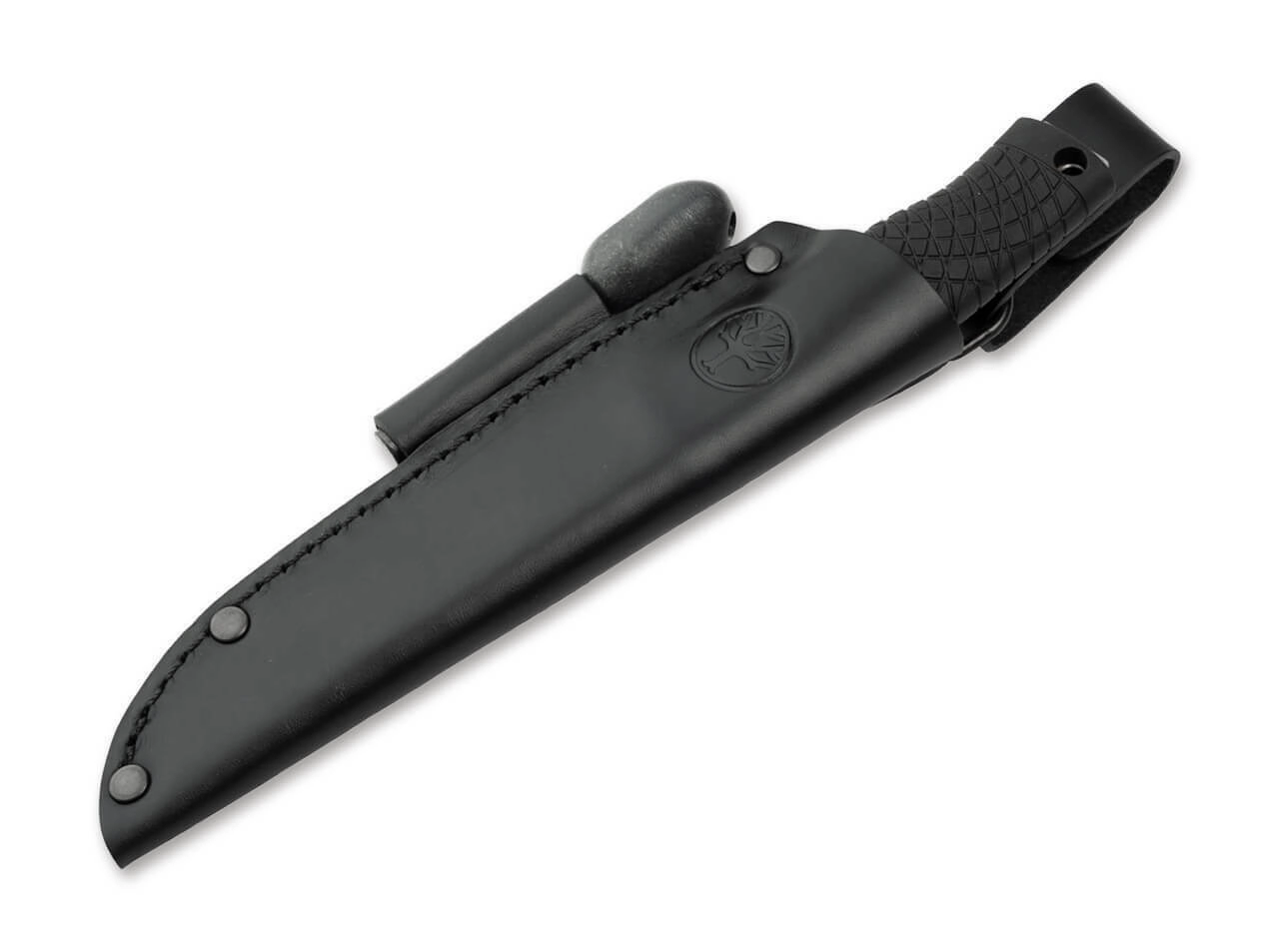 Den brede klinge i højtydende værktøjsstål CPM-3V med glat skær udmærker sig ved fremragende slidstyrke og sejhed. Den ensidige parérstang beskytter fingrene ved krævende snit, mens det ergonomiske håndtag i TPE med tekstureret overflade ligger sikkert i hånden, selv når den er våd.
