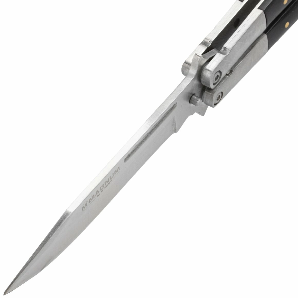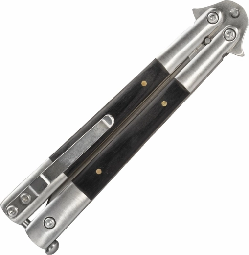 Magnum Wood balisong leverer pålidelig ydelse i et kompakt format. Drop Point-klingen med glat skær og fladt slib er fremstillet af rustfrit stål 440C, som udmærker sig ved høj korrosionsbestandighed og god skærretention. Den satinerede overflade giver et elegant udtryk og gør vedligeholdelsen lettere.