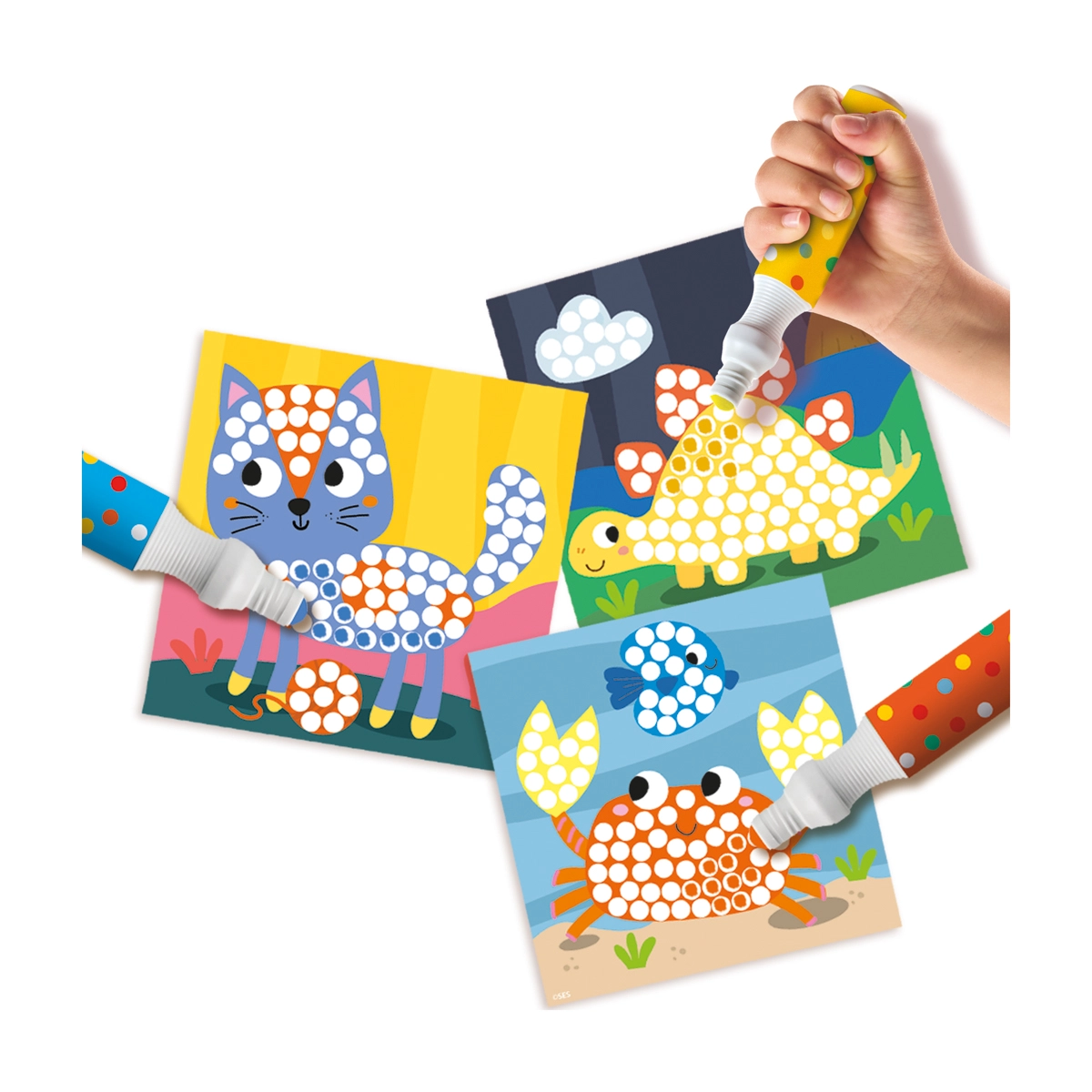 Dette kreative sæt med dot-tuscher tilbyder en enkel og glædesfyldt måde at introducere børn til billedskabende aktiviteter. De store spidser laver tydelige prikker uden anstrengelse, farverne er vaskbare og kan let vaskes ud af tøjet.