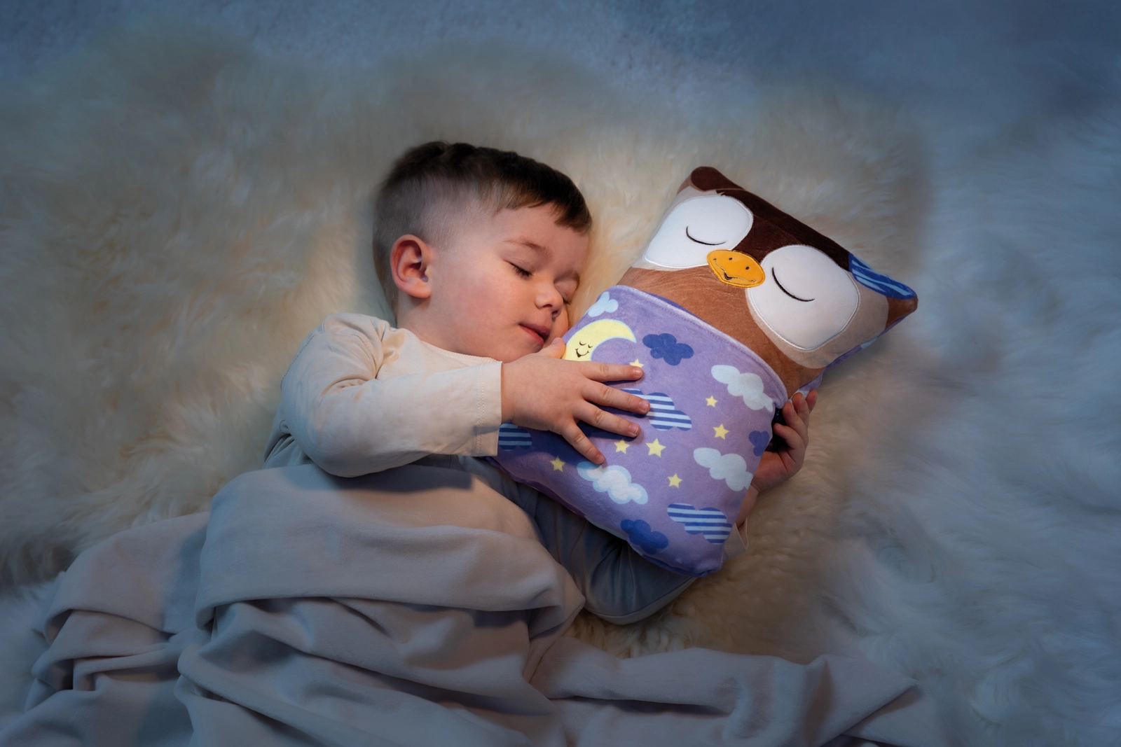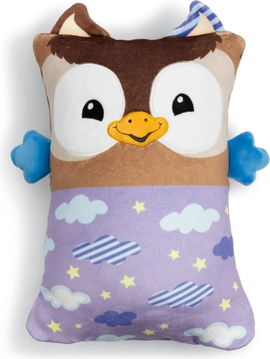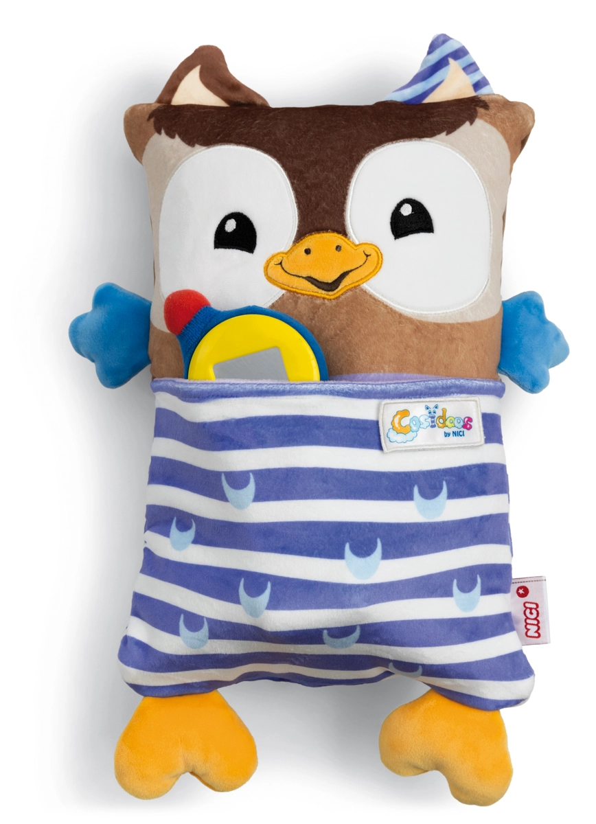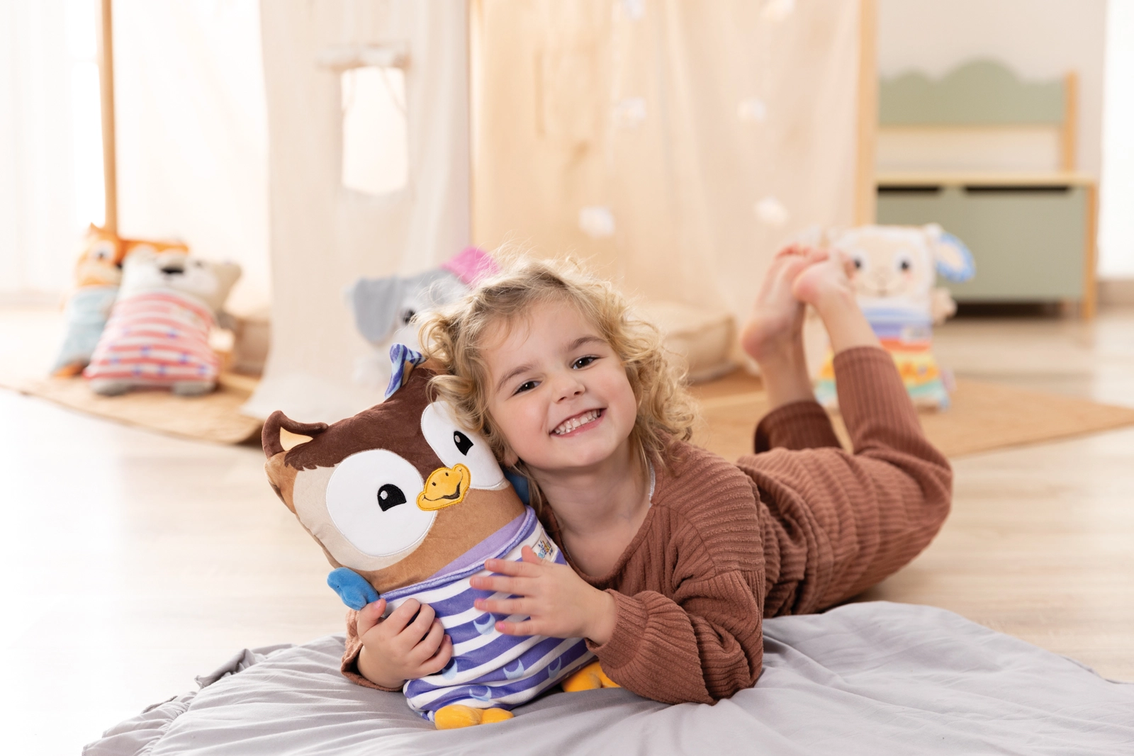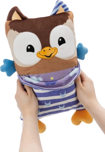 Oplev magien ved en glidende overgang mellem leg og afslapning. Denne plys-ugle Cosidoos hjælper børn med at forstå rytmen mellem dag og nat – om dagen inviterer den til fantasi og eventyr, om aftenen forvandles den til en krammepude med et blidt natmotiv for en rolig søvn.