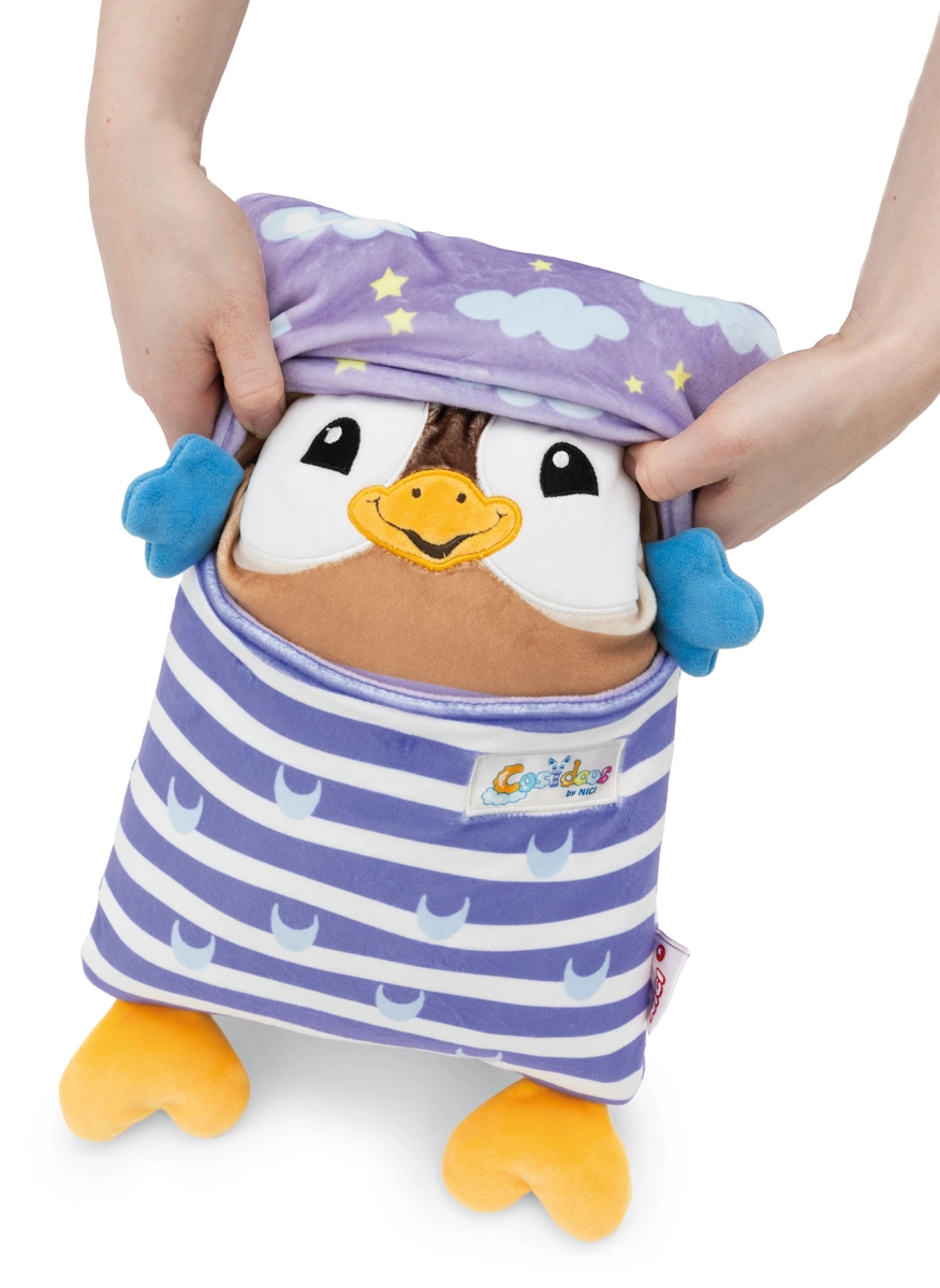 Med én enkel bevægelse vender du den og ændrer farver og design. De bløde lommer på forsiden er ideelle til at gemme små skatte, sut eller lommetørklæde. Fremstillet af højkvalitets, superblød NICI-plys for maksimal komfort og sikker hygge.