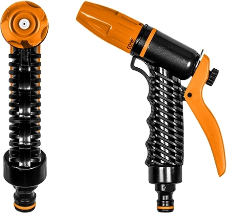 Det ergonomisk formede greb ligger behageligt i hånden, og håndtaget til regulering af gennemstrømning giver præcis kontrol over vandforbruget. Den robuste plastkonstruktion er designet til langvarig brug og modstandsdygtighed over for vejrpåvirkninger.