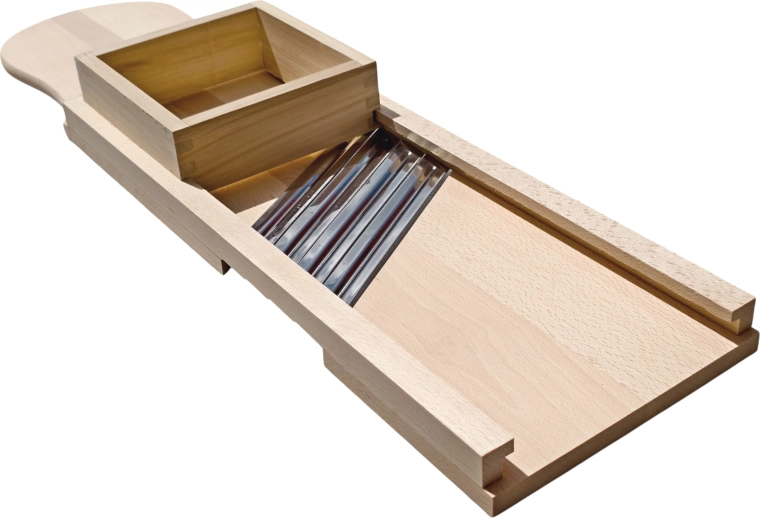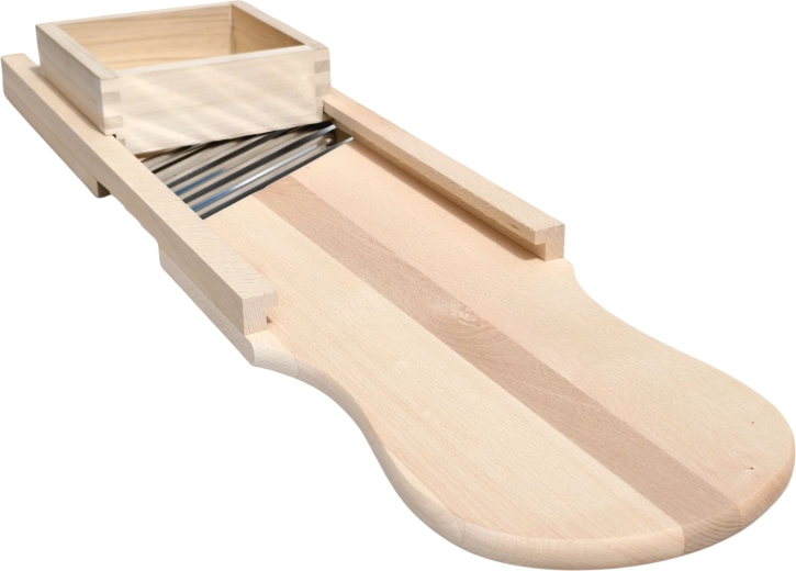 Opdag en gennemprøvet løsning til tilberedning af hjemmelavet kål, salater og pickles. Denne store trækålskærer er fremstillet af massivt naturtræ, som er hygiejnisk og usædvanligt robust. Fire skarpe knive i rustfrit stål sikrer jævn og præcis snitning med ensartede skiver, mens den integrerede skuffe/styreboks fører råvaren sikkert og beskytter fingrene under arbejdet.