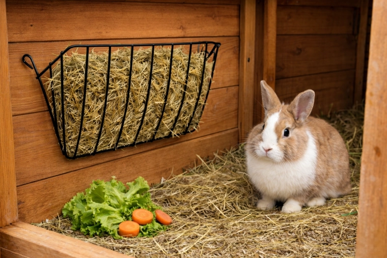 Fyld høhækken ovenfra og hold høet over strøelsen – mindre spild, mere renlighed og bedre hygiejne i kaningården.