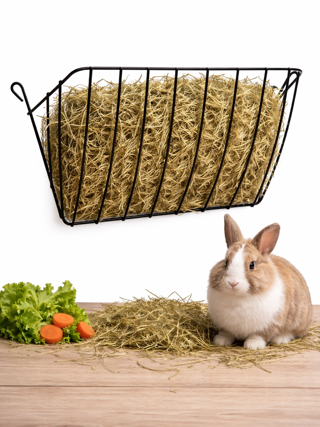 Stor høhæk til kaniner med praktisk topfyldning sikrer ren og hygiejnisk udfodring af hø. Den åbne trådkonstruktion giver dyrene nem adgang, mens høet forbliver over strøelsen og ikke spildes.