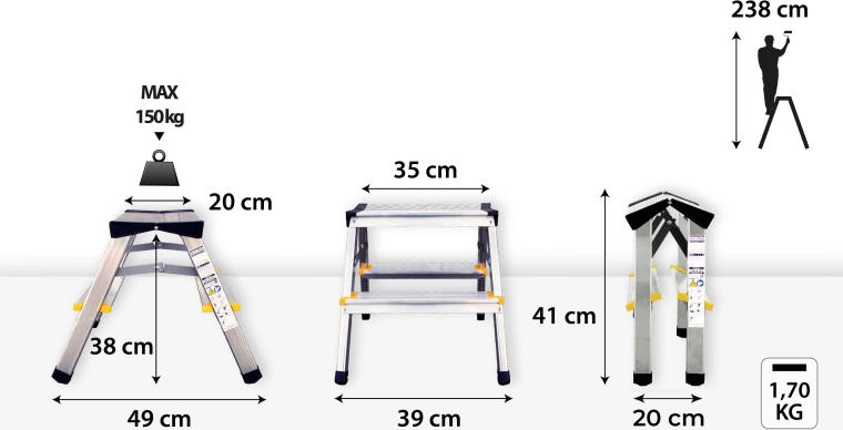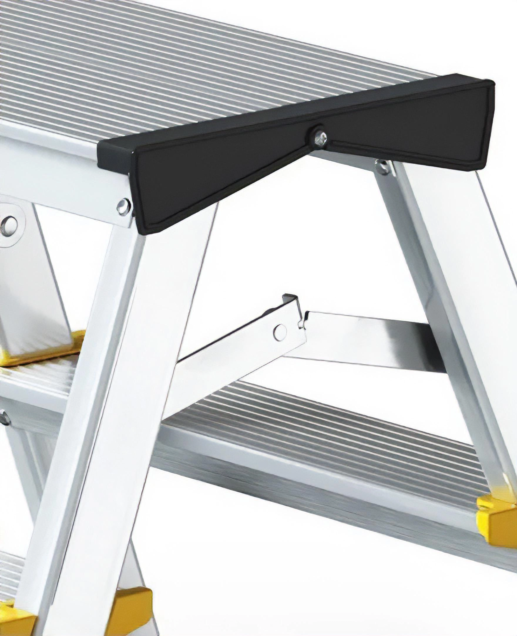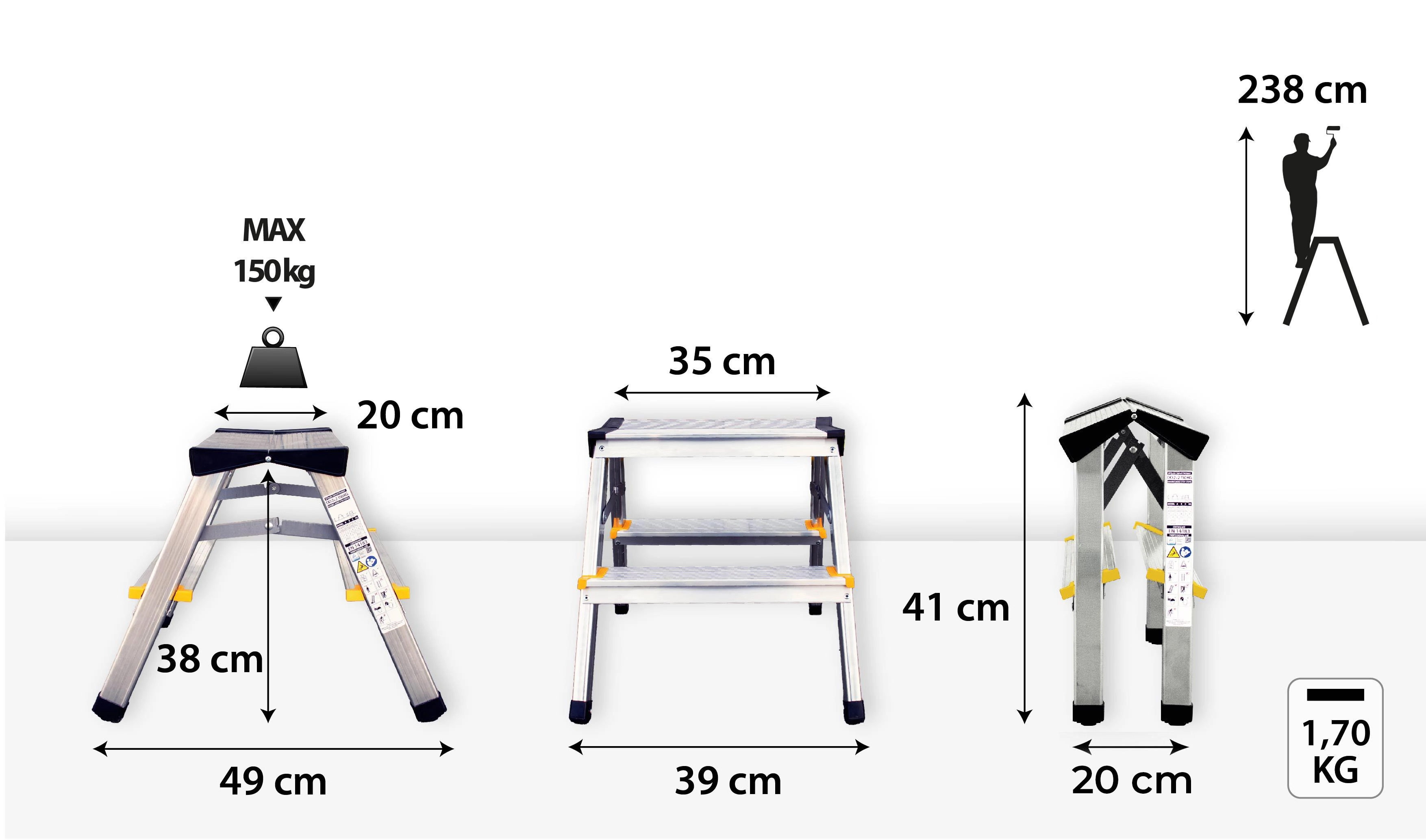 Stabiliteten sikres af forstærkede afstivninger, skridsikre fodender og en sikkerhedshængsel, der forhindrer for stor åbning. Trinene foldes hurtigt til et kompakt format for nem transport og opbevaring. Takket være TÜV Rheinland-certificering og overensstemmelse med EN 14183 opfylder de krævende sikkerhedskrav.