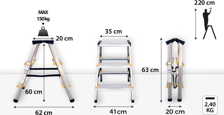 Den praktiske arbejdsplatform og hængsel, der begrænser for stor åbning, gør brugen lettere og øger sikkerheden ved daglige opgaver som maling, udskiftning af pærer eller arbejde i reoler. Stigen opfylder standarderne EN 131 / EN 14183 og har sikkerhedscertificering fra TÜV Rheinland, så du kan stole på dokumenteret kvalitet.
