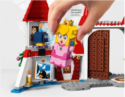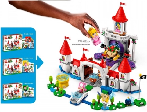 Træd ind i PRINCESS PEACH’ kongerige med den rigt detaljerede slotmodel, der udvider dine LEGO Super Mario baner. Her venter en tronsal med roterende væg, bag hvilken Bowser gemmer sig, en glasmaleri-rude med Peach, et hemmeligt maleri med actionmærke og en kage med Goomba. Der er også et særligt slotsrør, en tidsblok, en lavabro og en skål med lilla frugt.