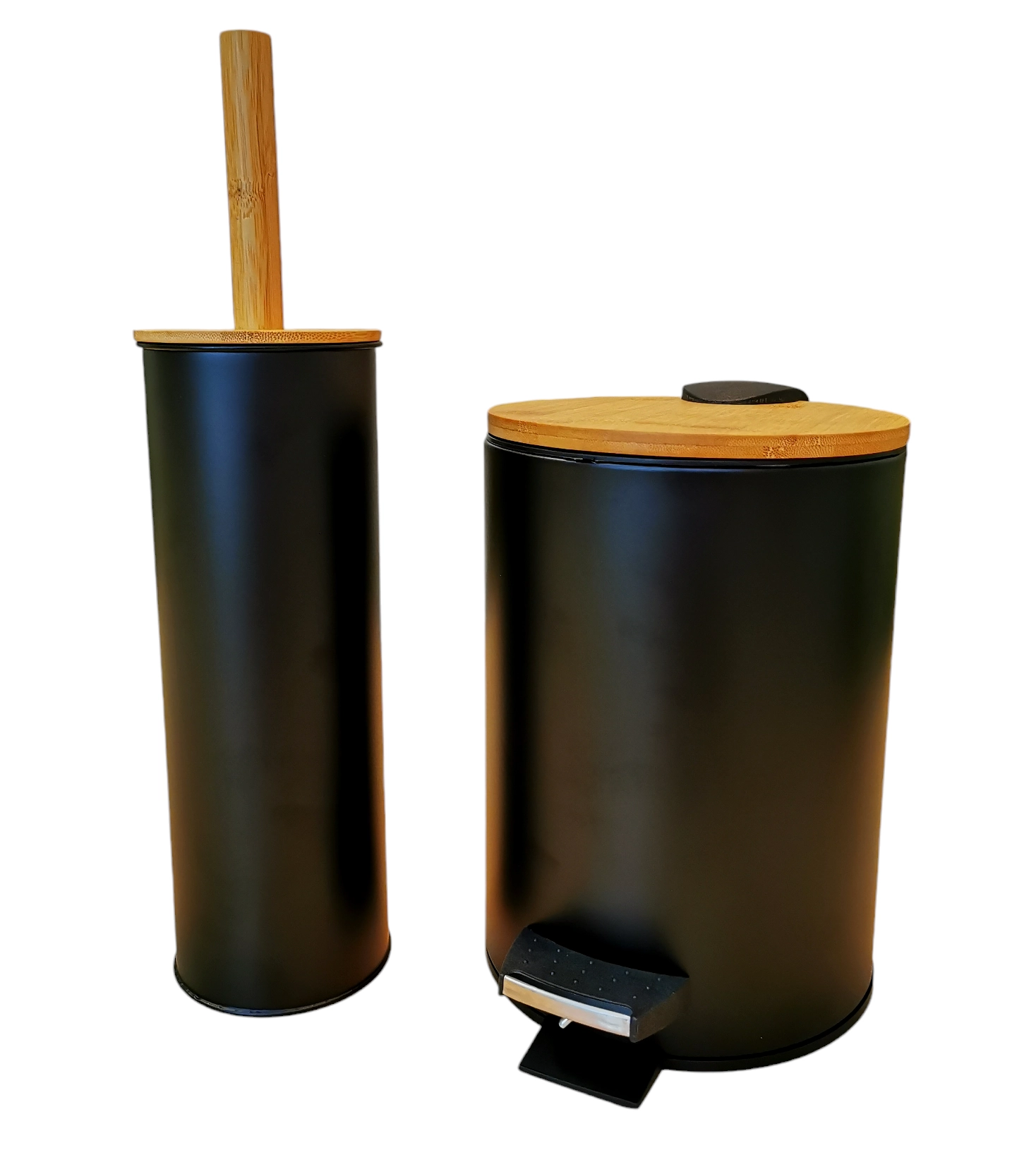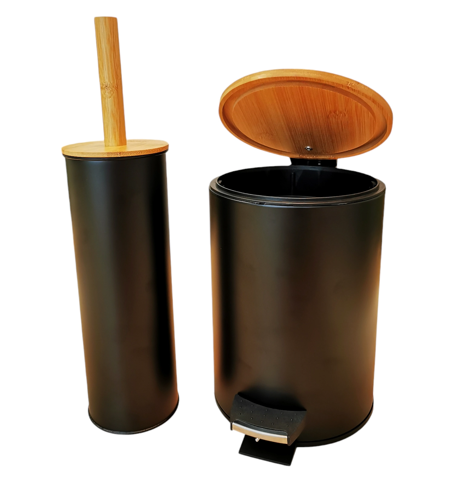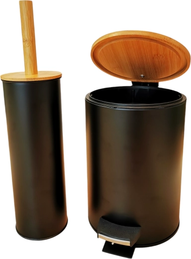 Elegant og funktionelt sæt til badeværelset, der forener design, hygiejne og komfort. Affaldsspanden på 3 liter har pedalåbning og dæmpet lukning Soft Close, så den ikke smækker og skåner låget. Den aftagelige inderbeholder gør det nemt at tømme og rengøre. Den matchende toiletbørste med holder i sort mat med bambusdetaljer fuldender det ensartede look på badeværelset.