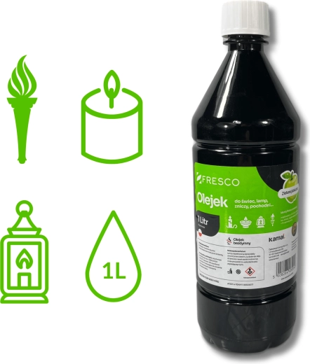 Olie til lamper, fakler og stearinlys med en behagelig æblearoma giver en stabil, lys og blid flamme uden uønsket røg (ved korrekt justering af vægen). Velegnet til havebelysning og til at gøre indretningen hyggeligere, ideel til dekorative lamper og klassiske olie-stearinlys.