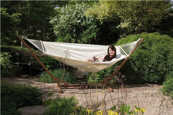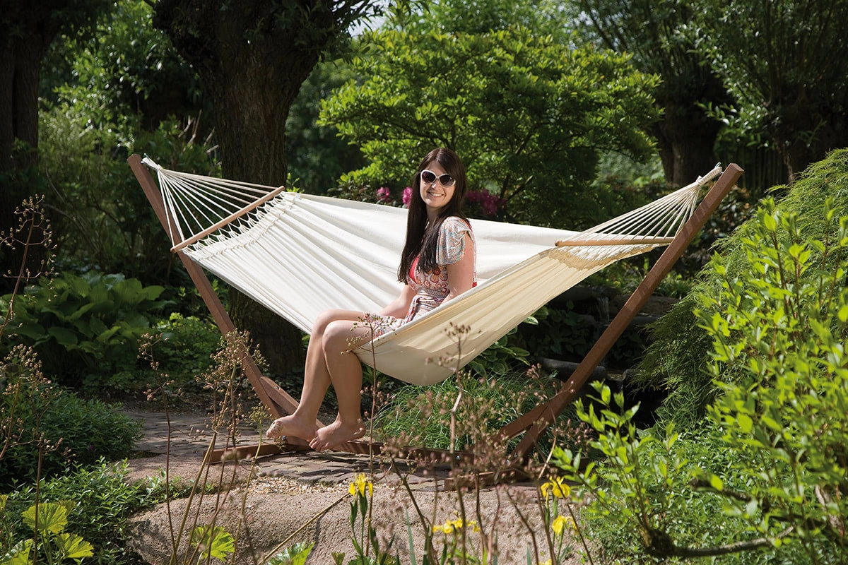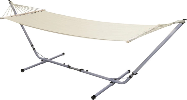 Hængekøjen Samba ecru er skabt til daglig afslapning. Takket være træspredestangen forbliver stoffet åbent og fladt, hvilket gør det lettere at sætte sig og giver en stabil, komfortabel liggestilling. Det slidstærke bomuldsstof med høj gramvægt føles behageligt og holder længe.