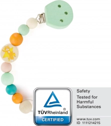 Den stærke metalclips fastgøres sikkert til de fleste tekstiler og forhindrer, at sutten falder på gulvet eller bliver væk. Overfladen er spytresistent, og den anvendte finish er fri for giftige stoffer, så produktet er sikkert for babyer fra 0+.