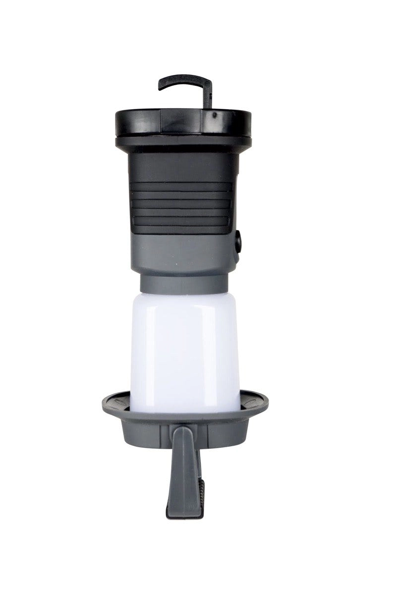 Den foldbare krog og håndtag muliggør ophængning i forskellige positioner, inklusive omvendt. Den stabile base er ideel til at stille på et bord eller i teltet.