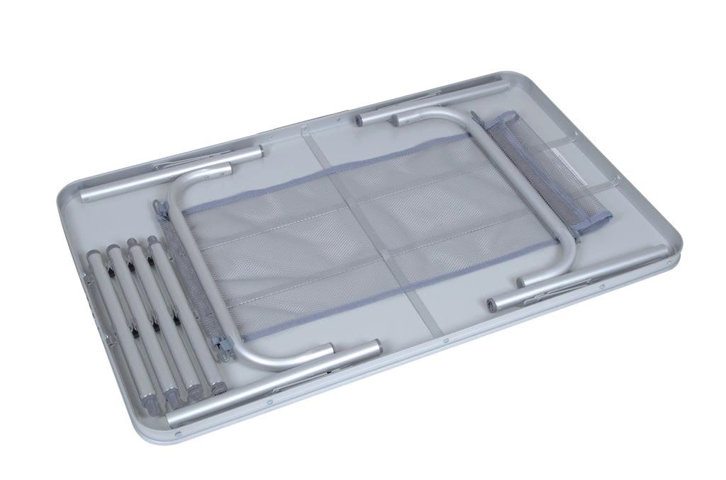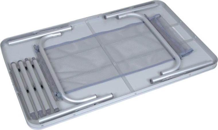 Leder du efter et pålideligt bord til camping, haven eller picnic? Dette sammenklappelige campingbord i let aluminium kombinerer holdbarhed, stabilitet og nem håndtering. Bordpladen er vandafvisende og varmebestandig, så den egner sig til udendørs brug og arbejde med varme gryder.