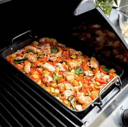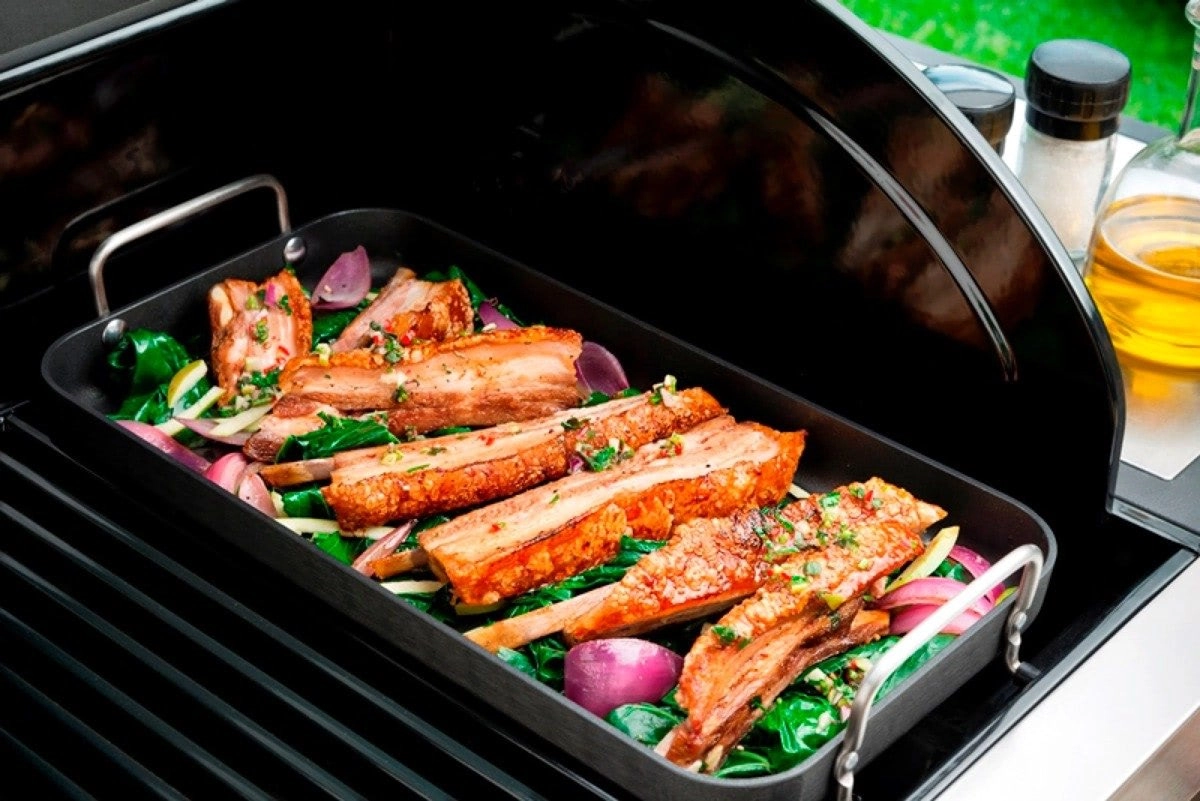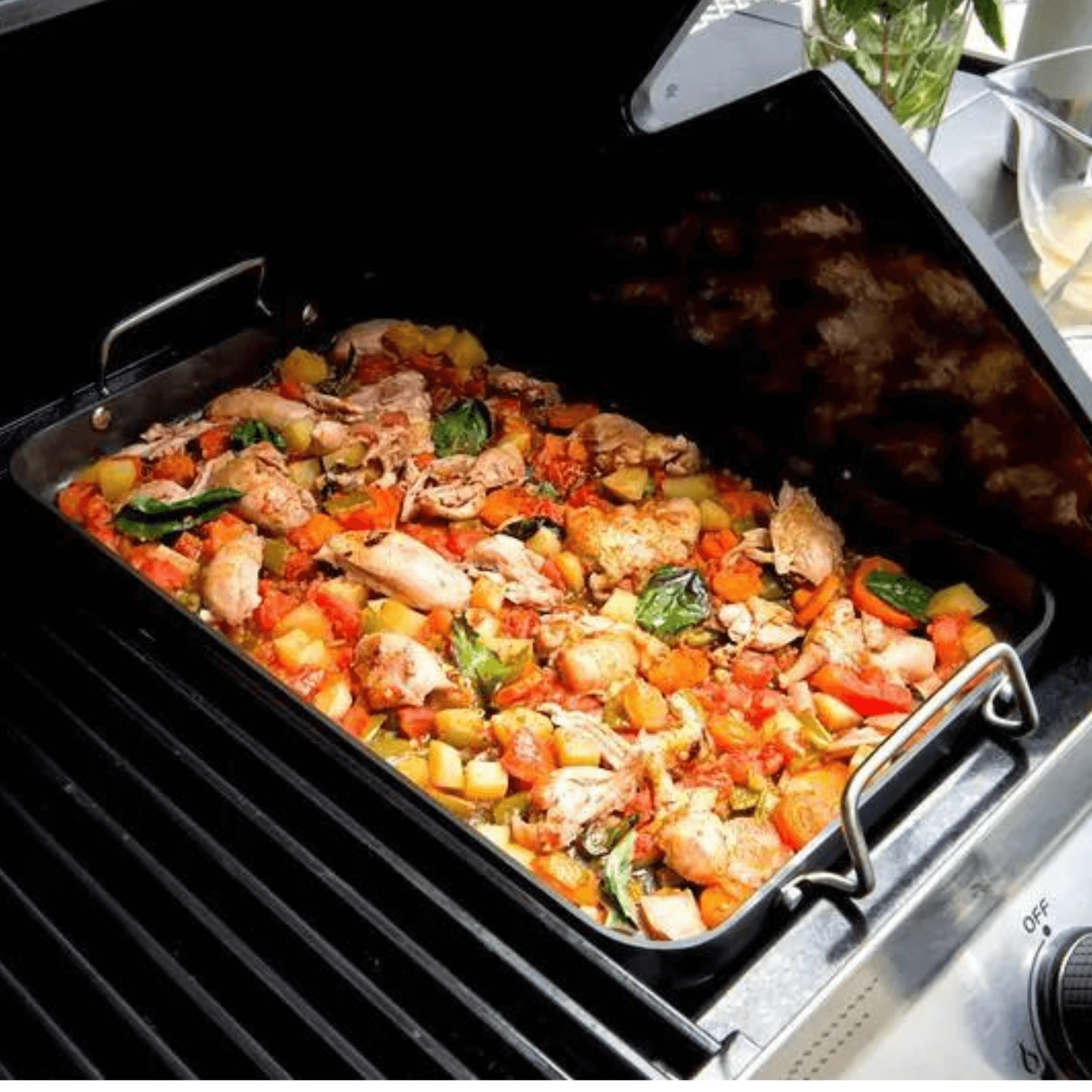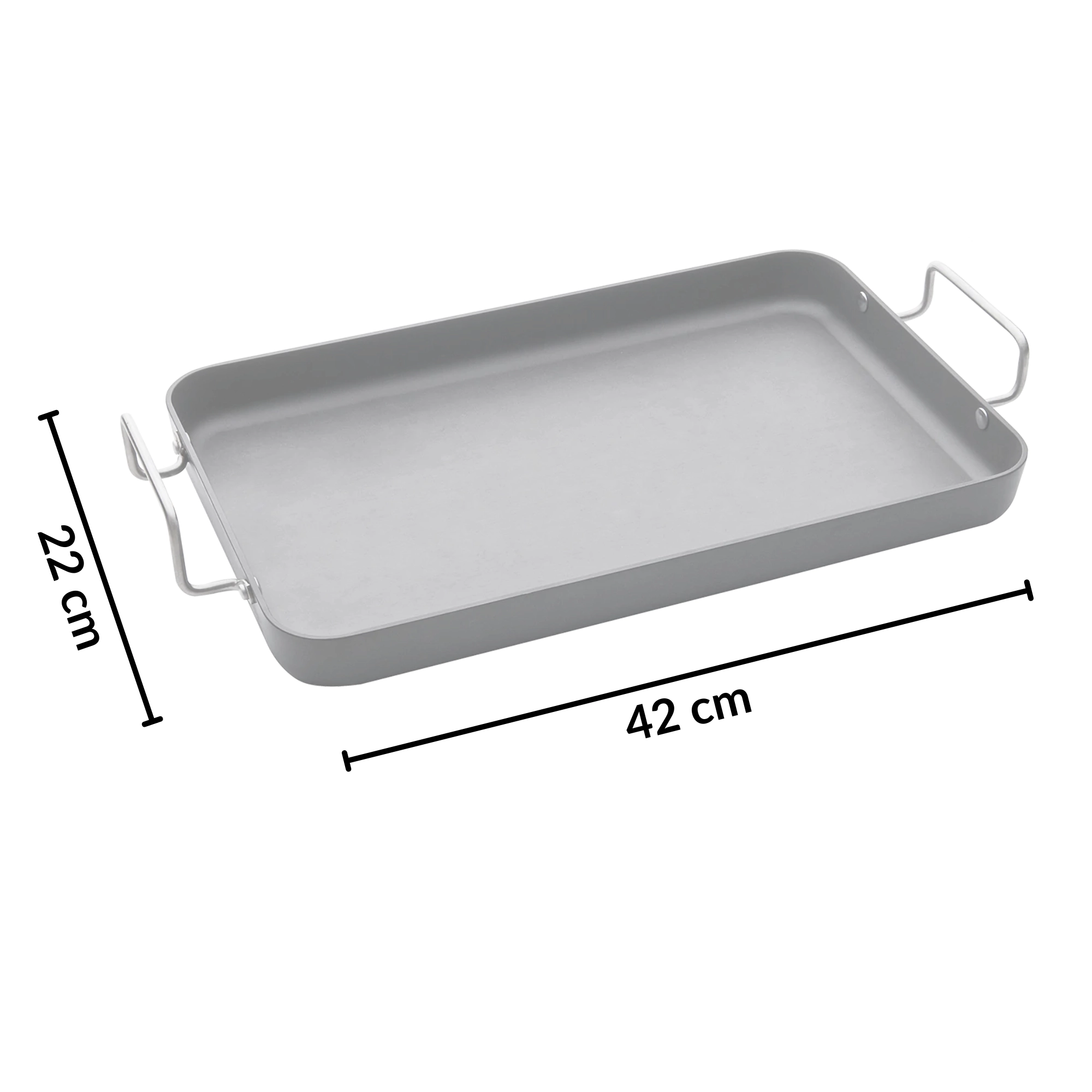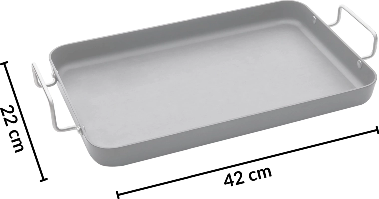 Det rektangulære design med lav kant sikrer effektiv varmeoverførsel og stabile resultater ved grillning, stegning og bagning.