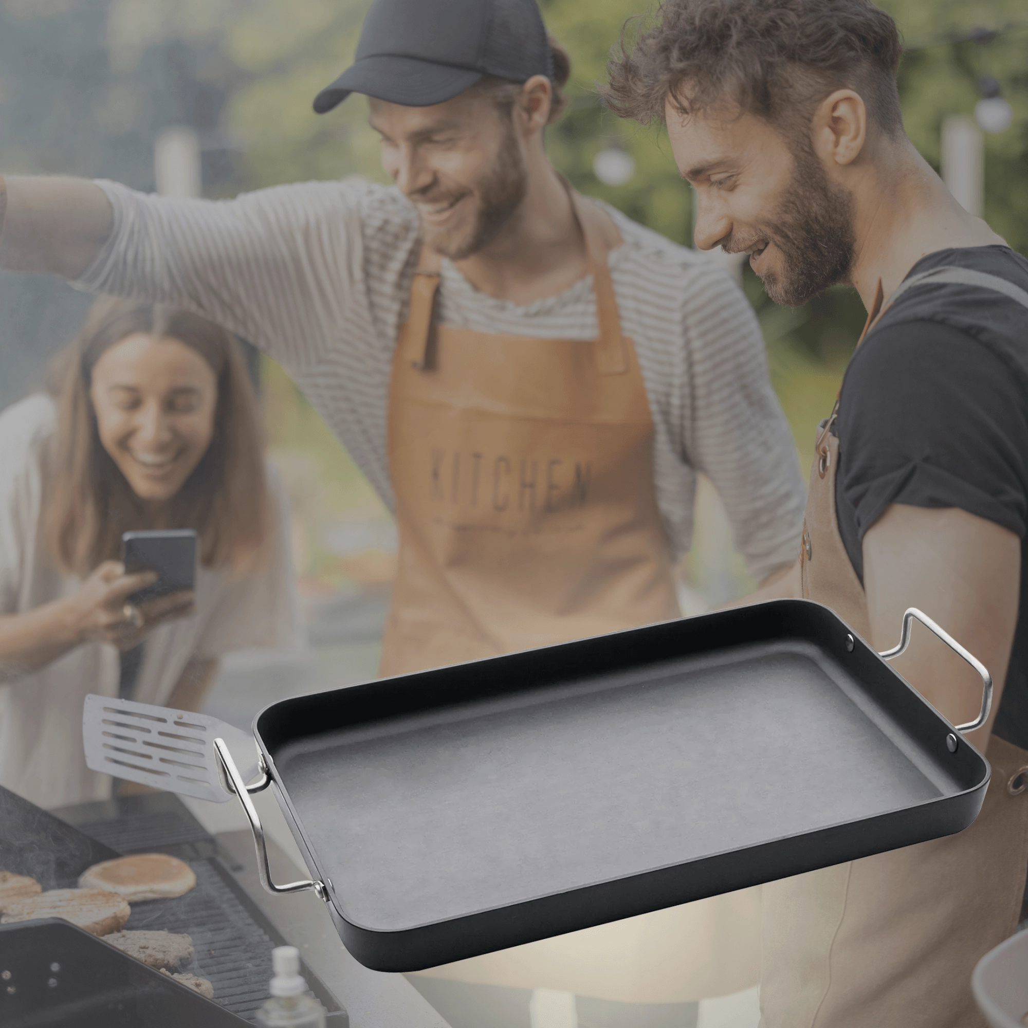 Denne rektangulære bradepande tilbyder en stor, plan overflade for ensartet tilberedning af kød, grøntsager og bagværk. Den robuste aluminiumskrop med hårdanodiseret ydre lag giver lang levetid, mens den nonstick-indvendige belægning minimerer fastbrænding og gør vedligeholdelsen enklere.