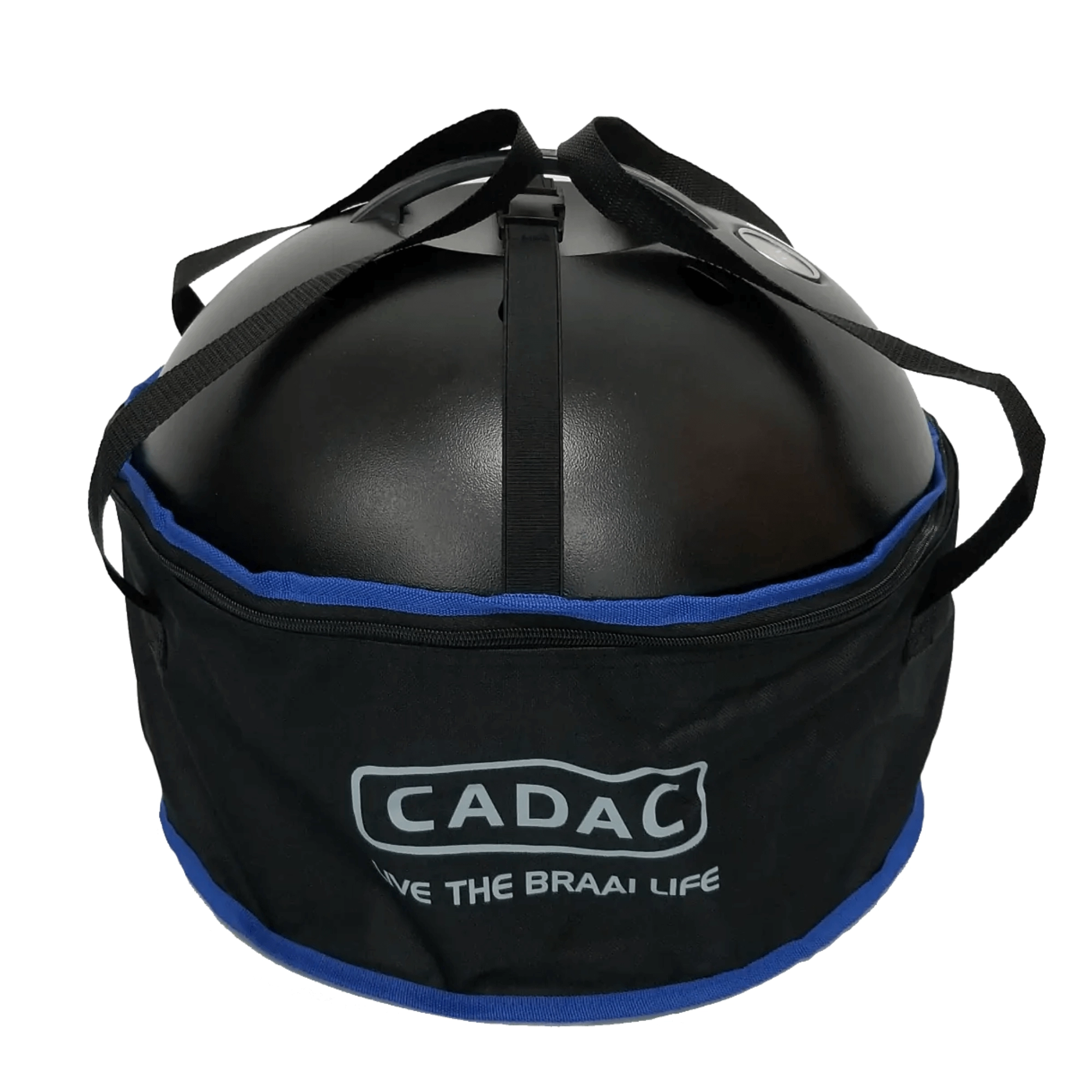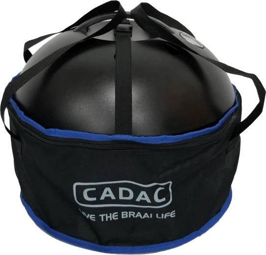 En grydeholder er inkluderet, og grillen er kompatibel med udskiftelige CADAC-overflader (paellapande, pizzasten). Den medfølgende taske sikrer sikker opbevaring og nem transport.