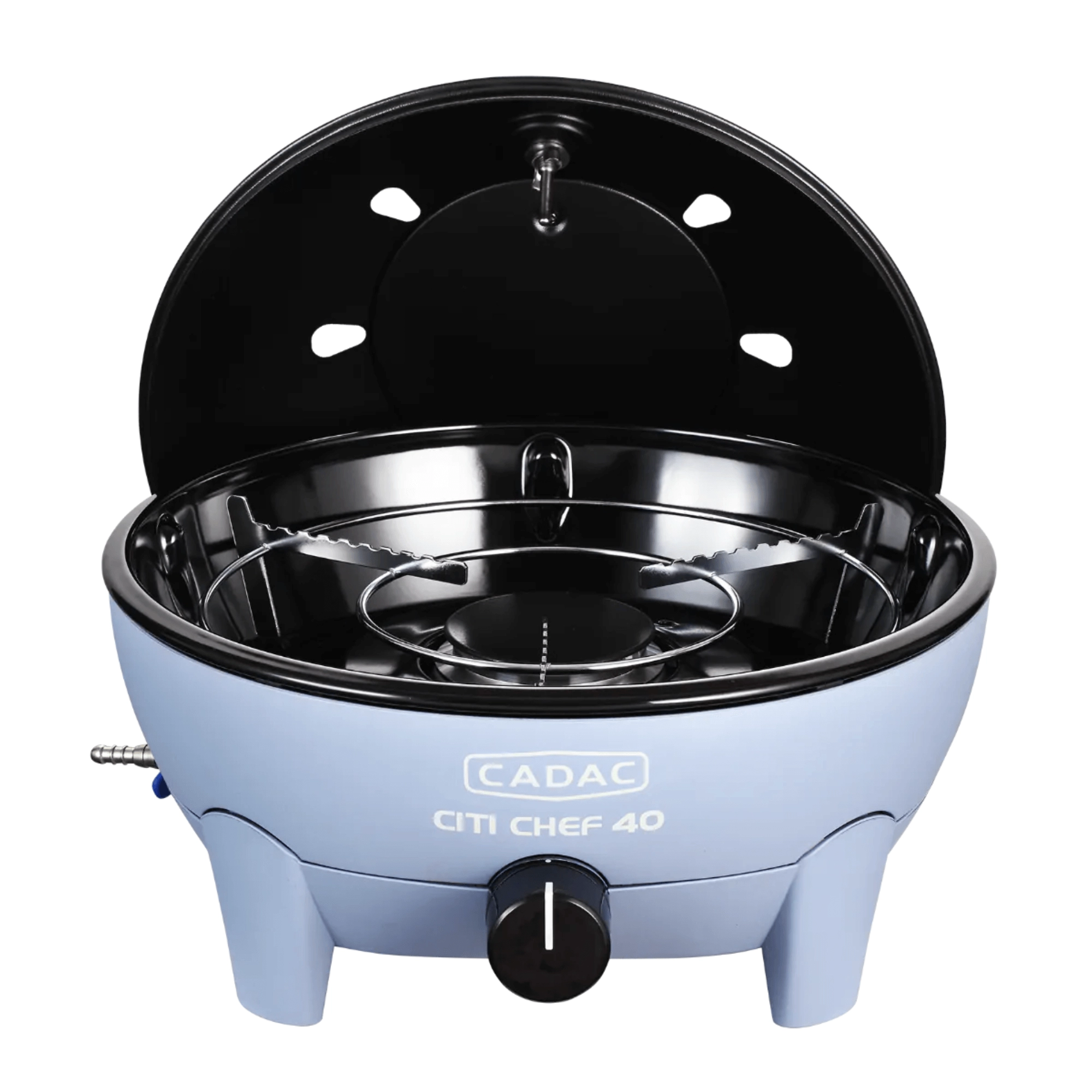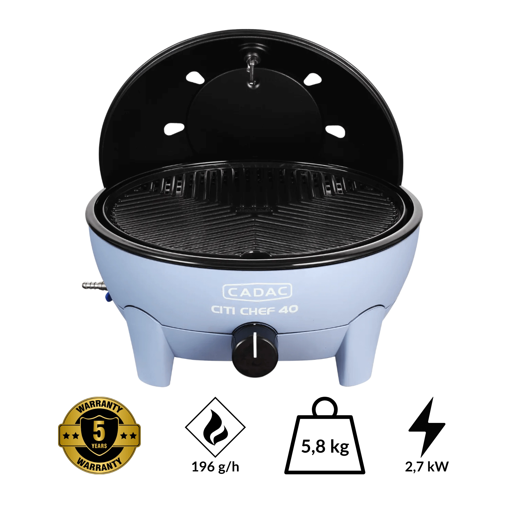 Aluminiumsristen med keramisk belægning sikrer fremragende varmeoverførsel og hurtig gennemstegning. Den aftagelige drypbakke i den ydre skål gør det let at tage ud og vaske. Grillen er kompatibel med udskiftelige CADAC-overflader (f.eks. paellapande, pizzasten), så du nemt kan udvide dine madlavningsmuligheder.