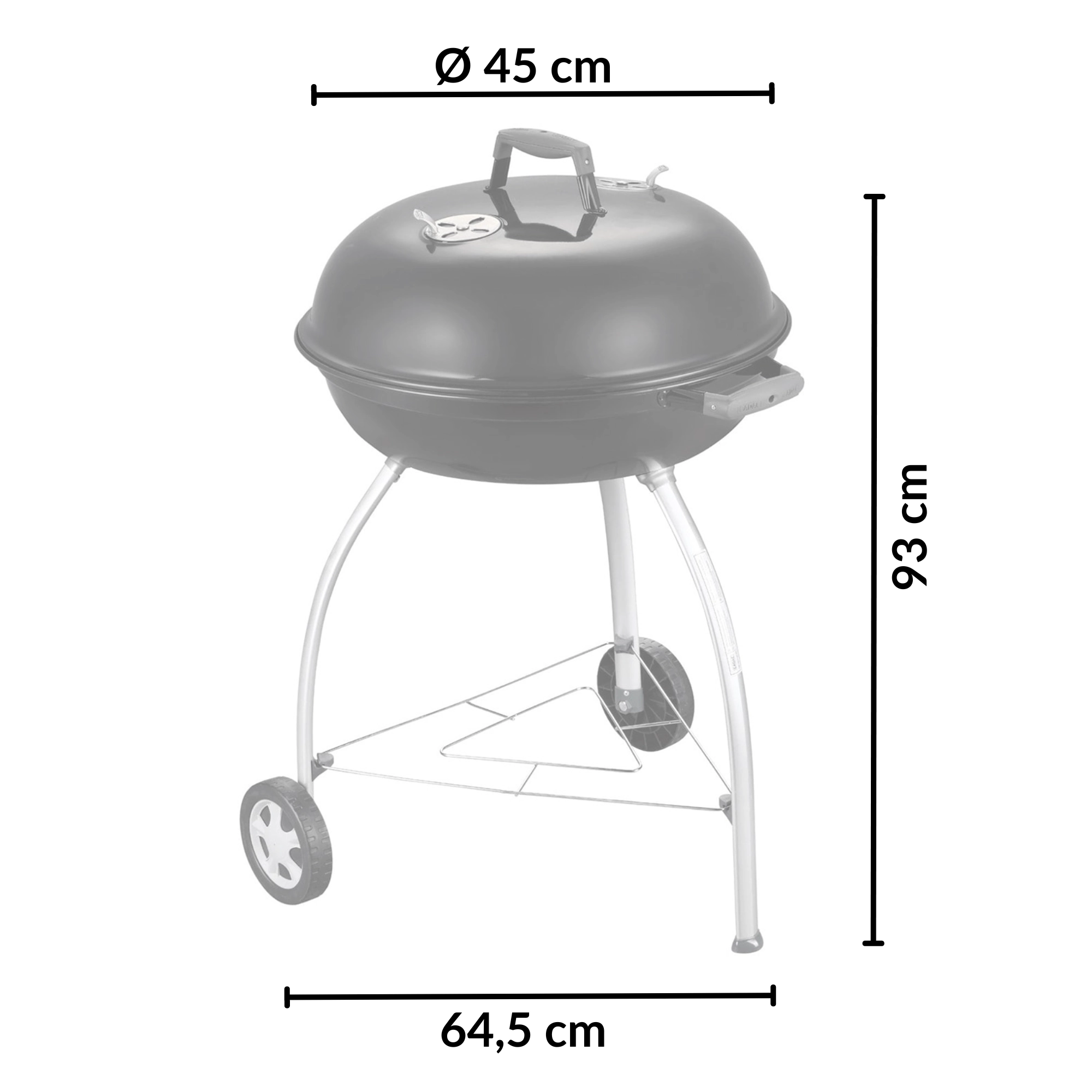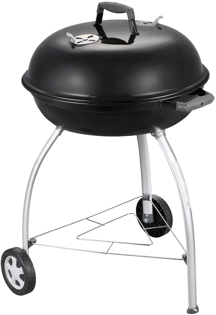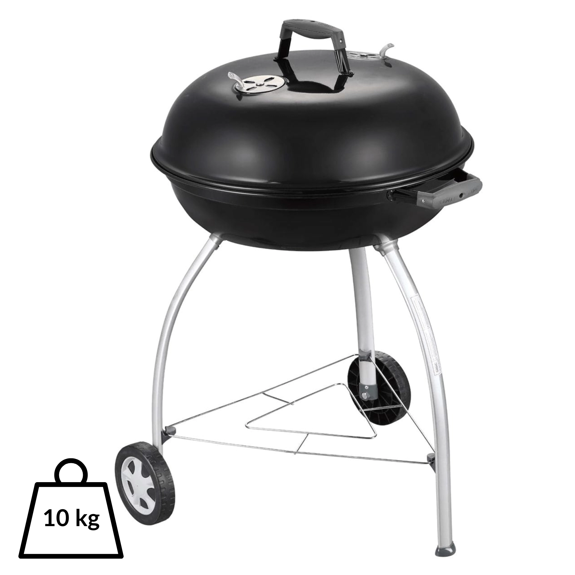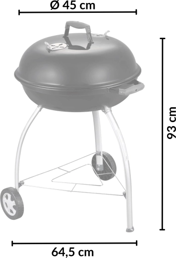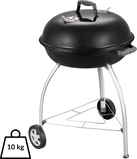 Takket være den store flade på 54 cm tilbereder du saftige bøffer, grøntsager og hele portioner til familie og venner. Omfoldede, emaljedækkede kanter beskytter mod korrosion, og et praktisk beslag i låget gør det muligt at hænge det på skålen som vindbeskyttelse. To hjul og tre solide ben sikrer stabilitet og nem mobilitet på terrasse eller i have.
