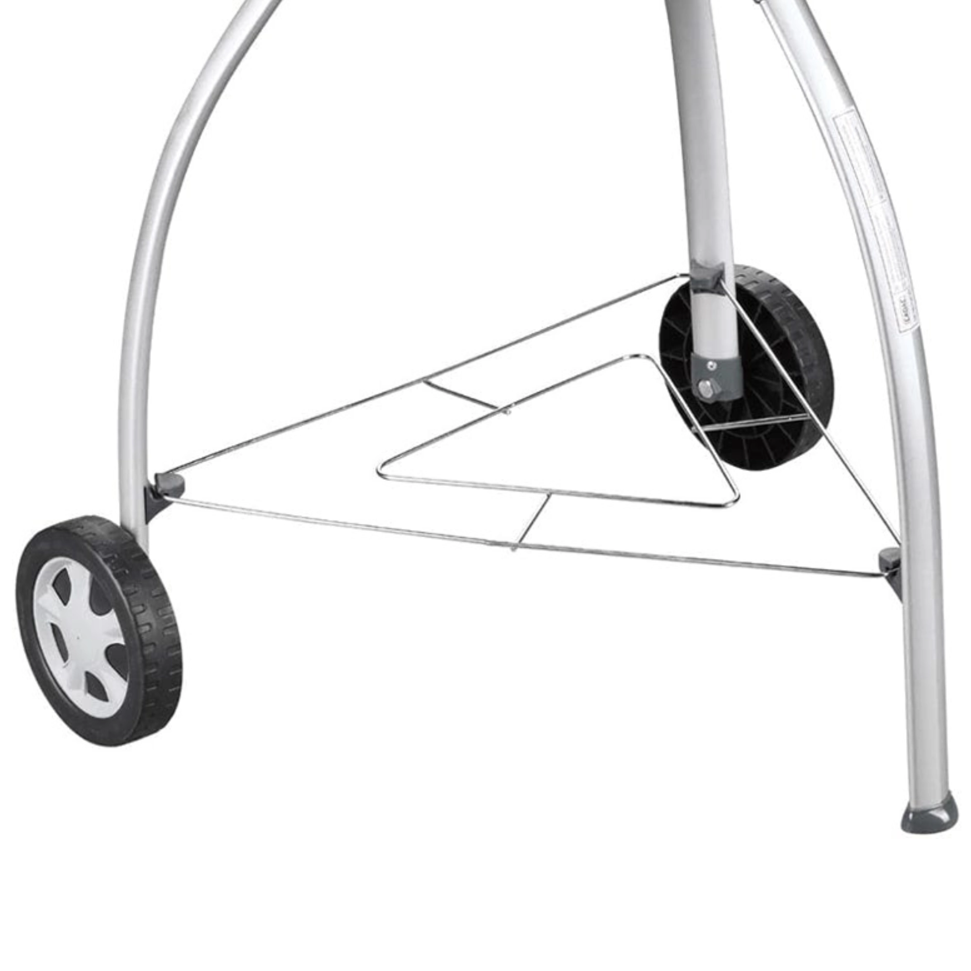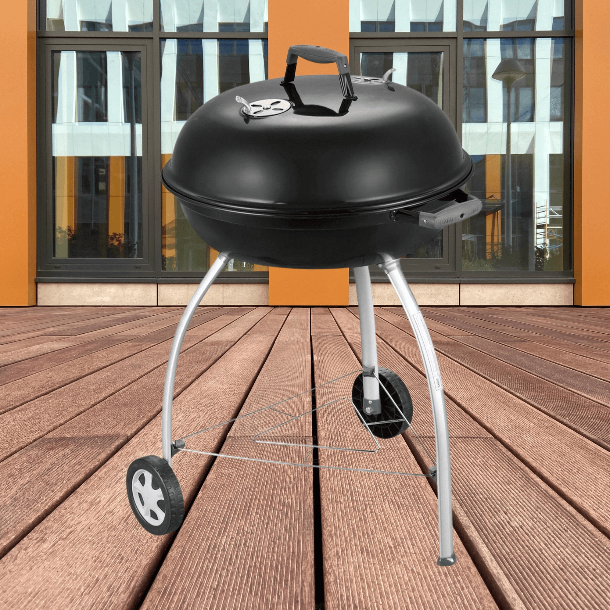 To hjul for nem flytning i haven og tre solide ben med forstærket hylde for sikker stabilitet under grillning.