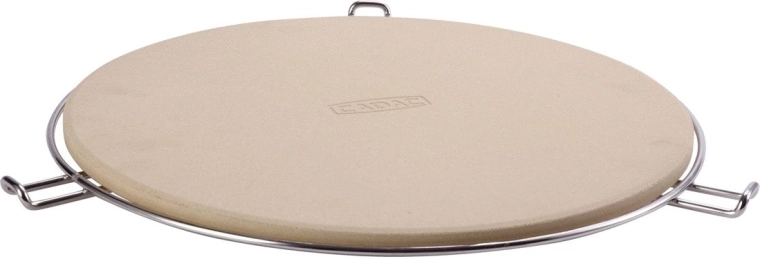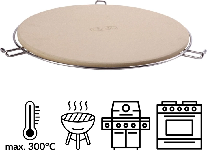 Pakken indeholder et forkromet stativ med sidehåndtag, som gør det lettere at flytte den varme sten fra grill eller ovn til bordet. Takket være modstandsdygtighed op til 300 °C og den universelle runde form er den perfekt til pizza, focaccia og brød.