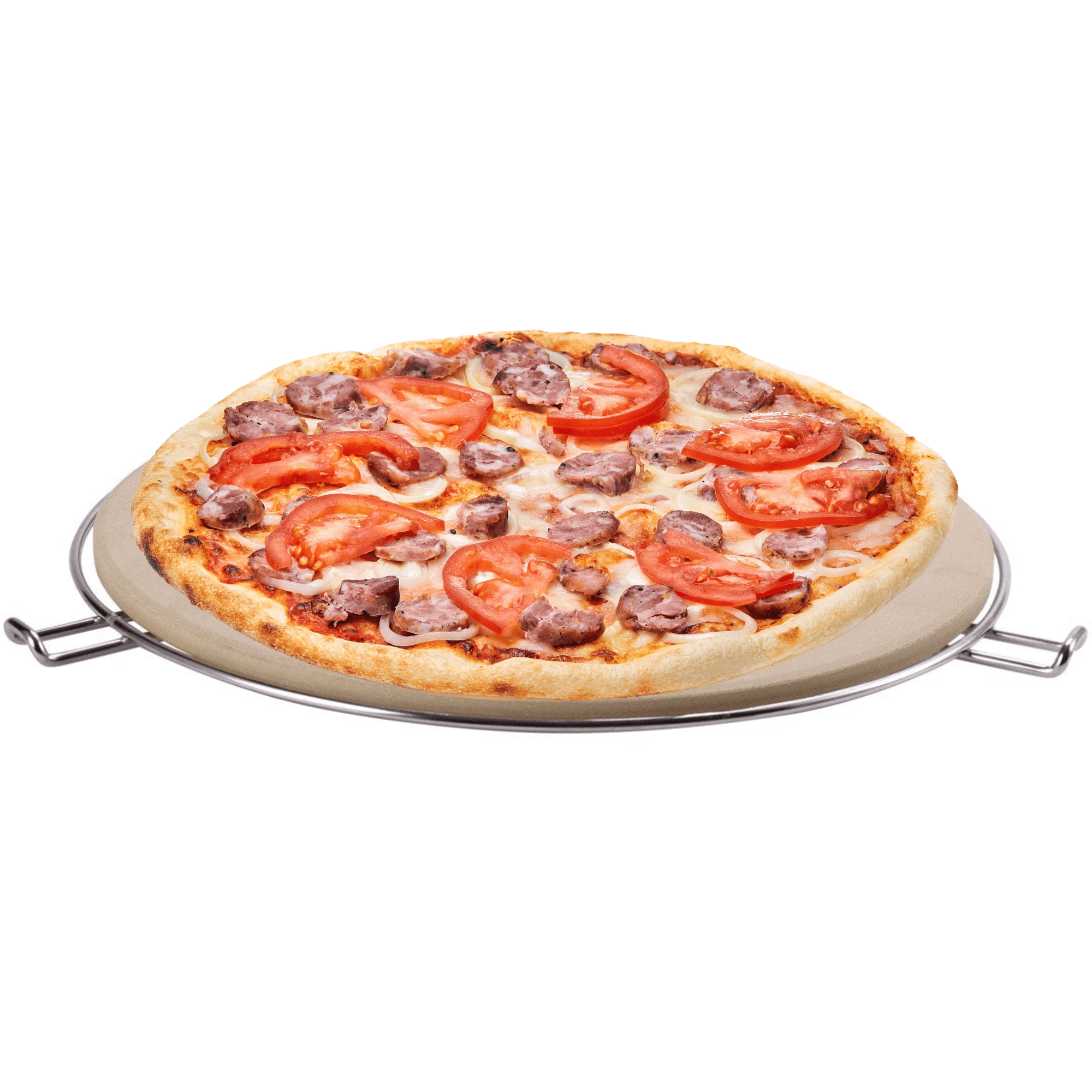 Det forkromede trådstativ med sidehåndtag gør det nemt at flytte stenen fra ovn eller grill direkte til bordet.