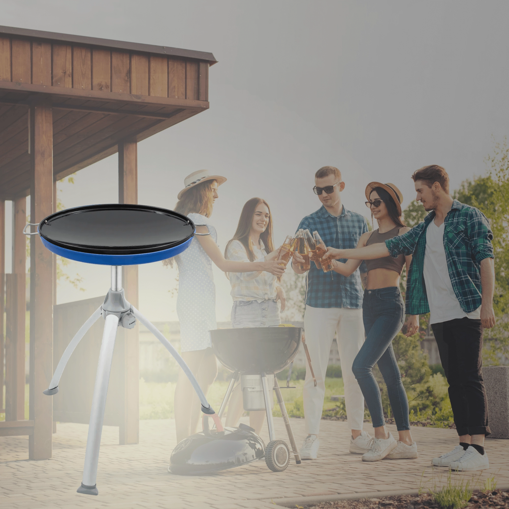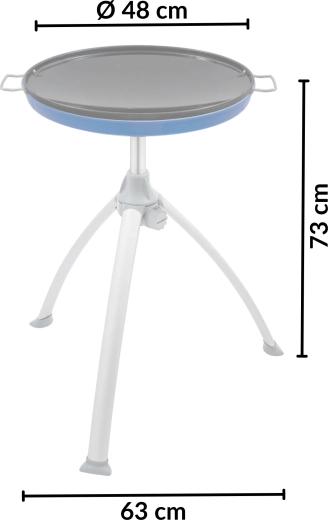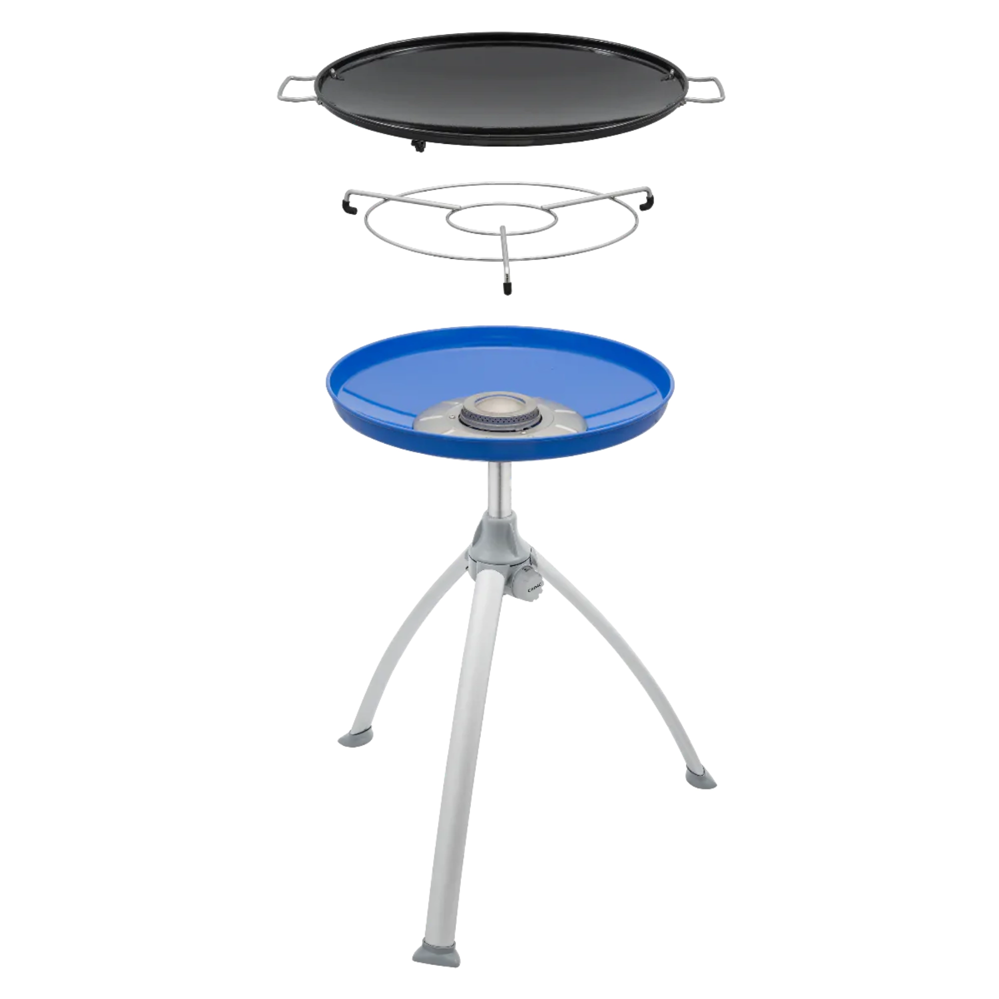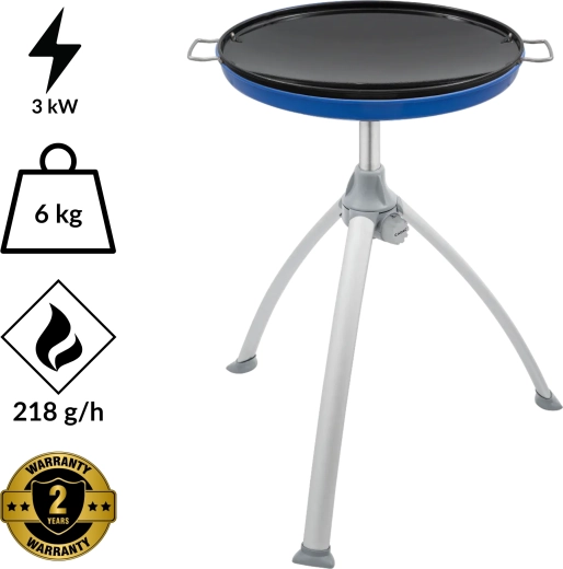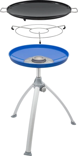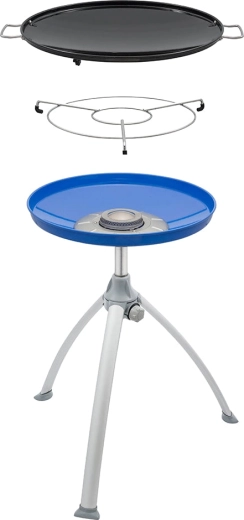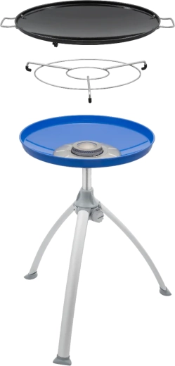 Den lette konstruktion med sammenklappelige aluminiumsben og en praktisk transporttaske sikrer nem transport og opbevaring. Den aftagelige krydderihylde holder alt nødvendigt inden for rækkevidde. Grillen bruges med en genopfyldelig gasflaske (slange og regulator er ikke inkluderet).