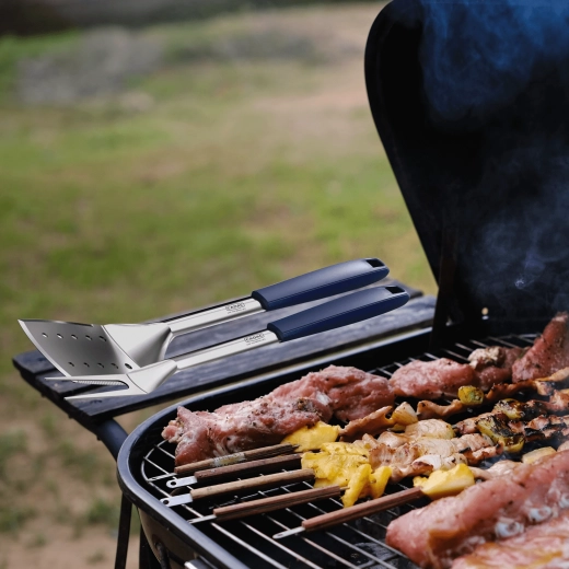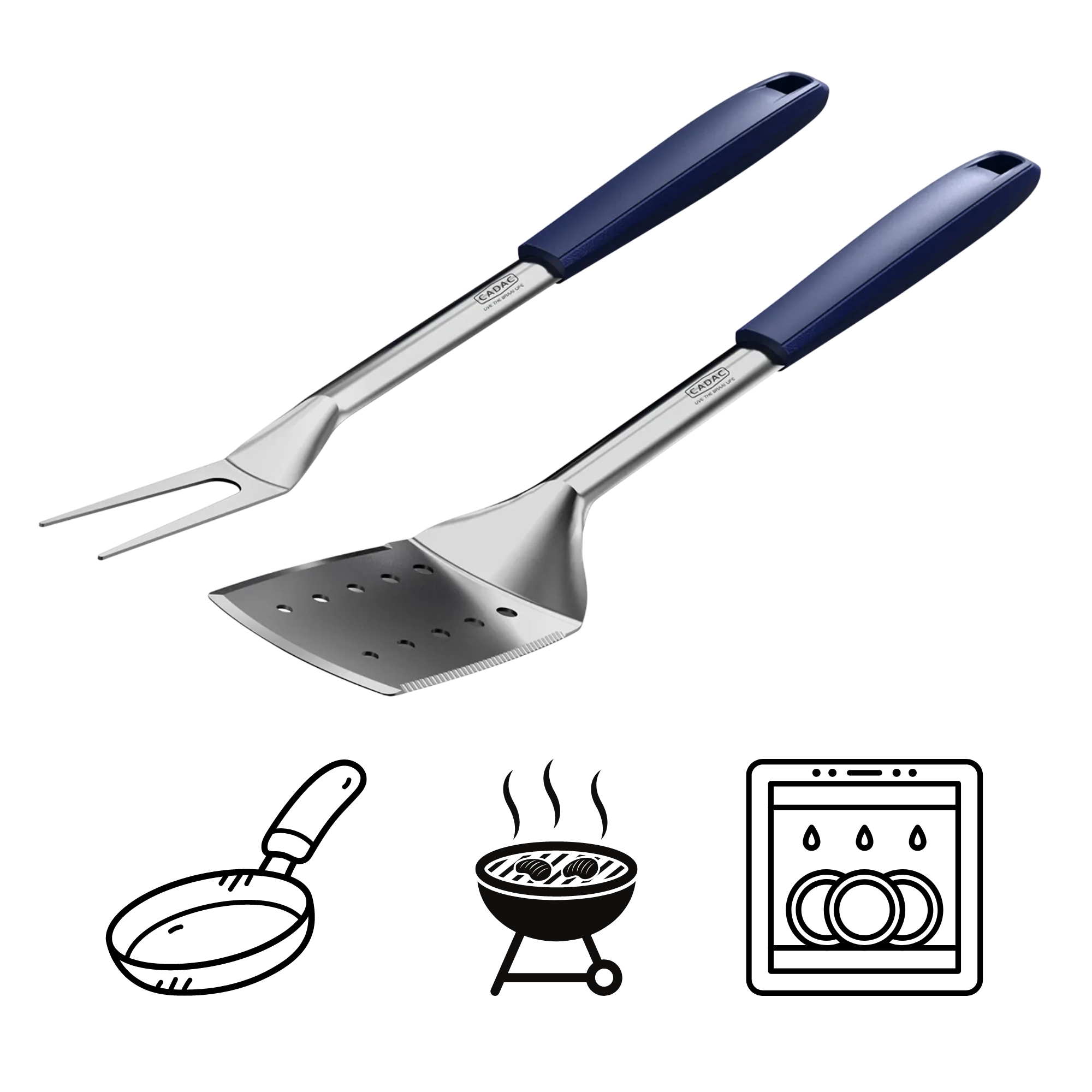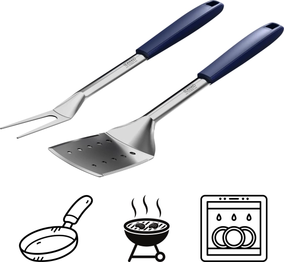 Spatlen med bredere hoved er ideel til at vende bøffer, fisk og burgere, mens gaflen gør det nemt at stikke i og flytte kød. Den robuste konstruktion og gennemtænkte ergonomi gør sættet til et fremragende valg til havegrill såvel som til hverdagsmadlavning.