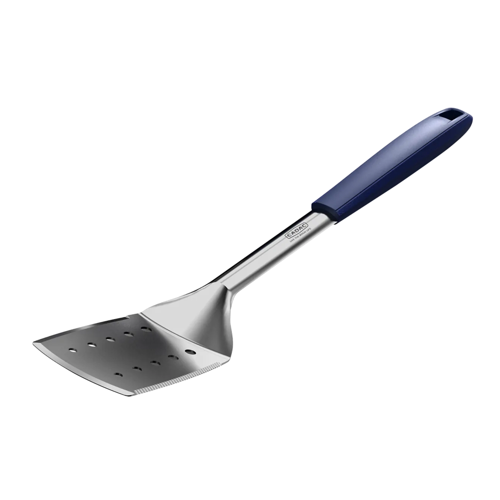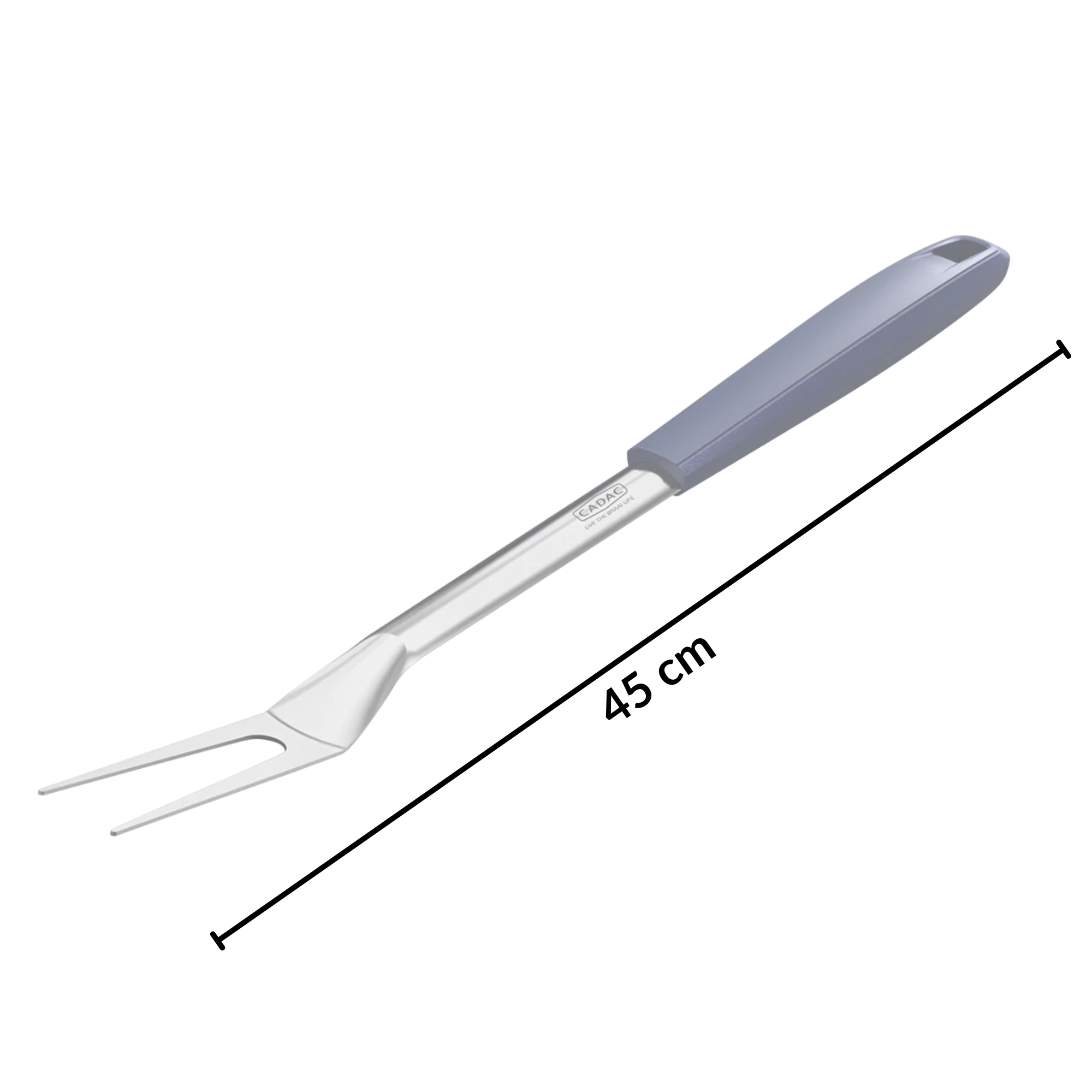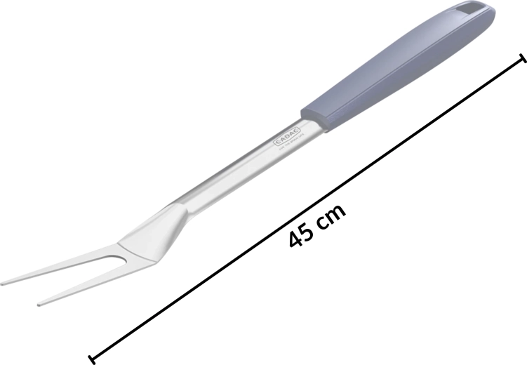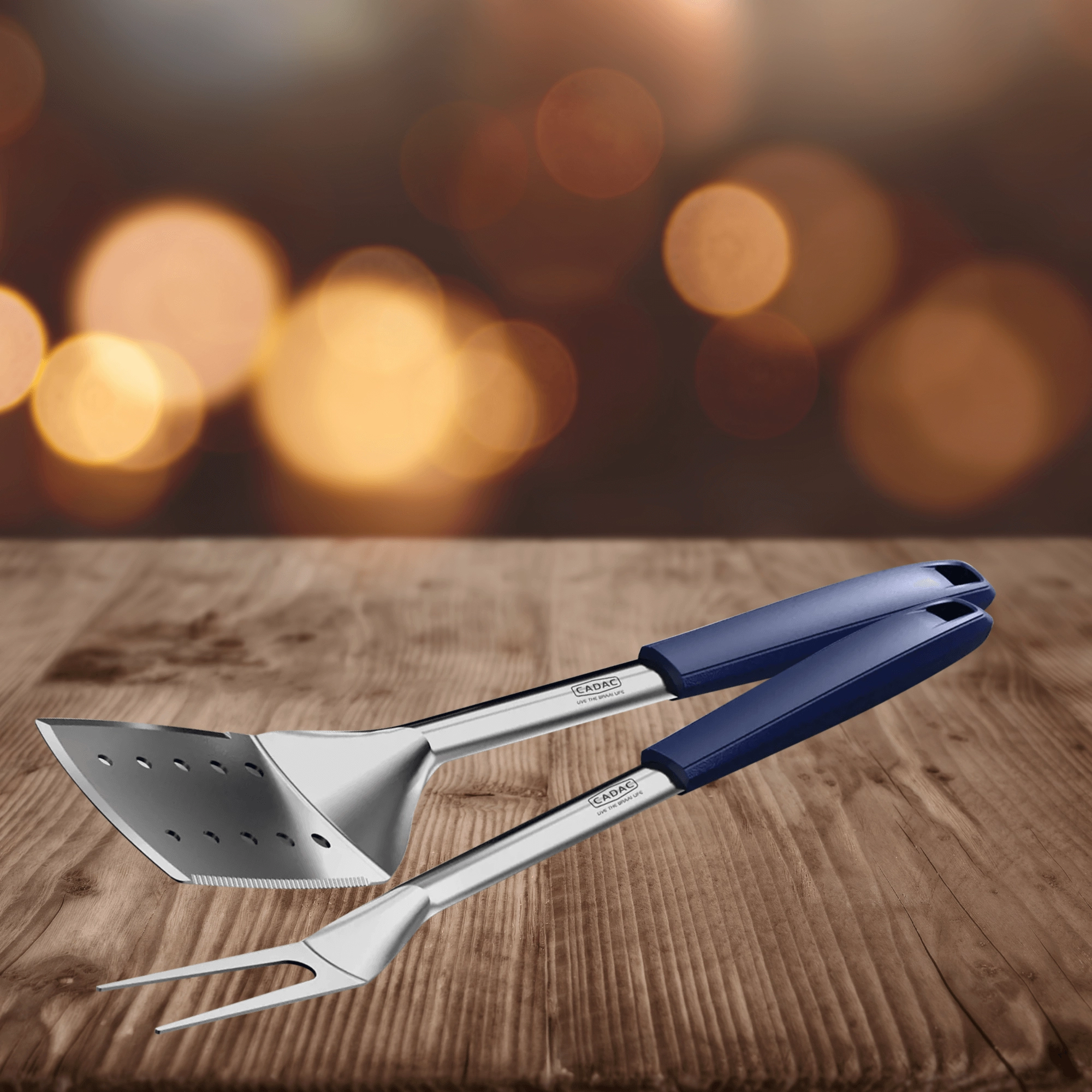 CADAC-sættet kombinerer rustfrit stål til arbejdssiderne med varmeresistent plast på håndtagene. De lange redskaber (45 cm) giver kontrol og god afstand til varmen, mens de magnetiske ender muliggør hurtig placering på en metaloverflade (undtagen rustfrit stål). Integrerede støtter holder spidserne over bordpladen og forhindrer kontakt med snavs.