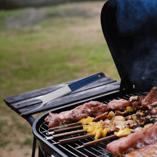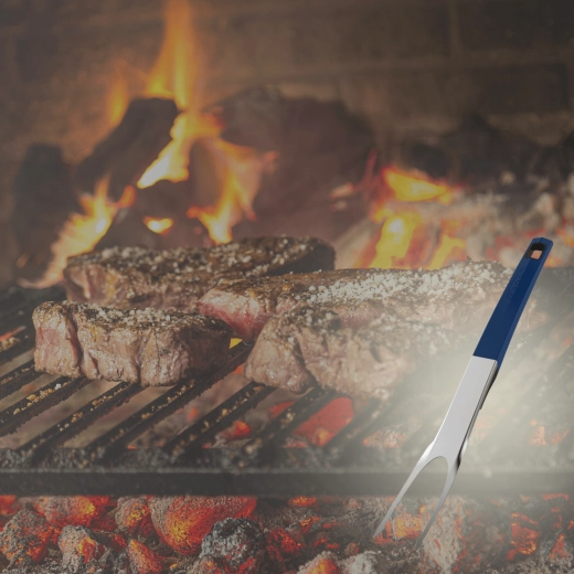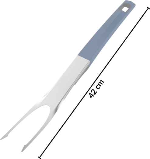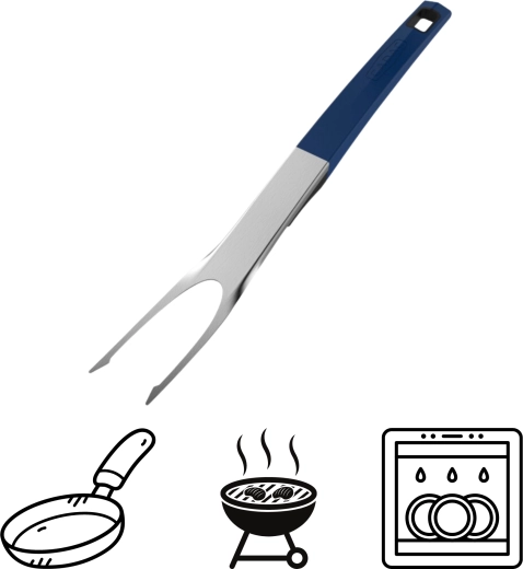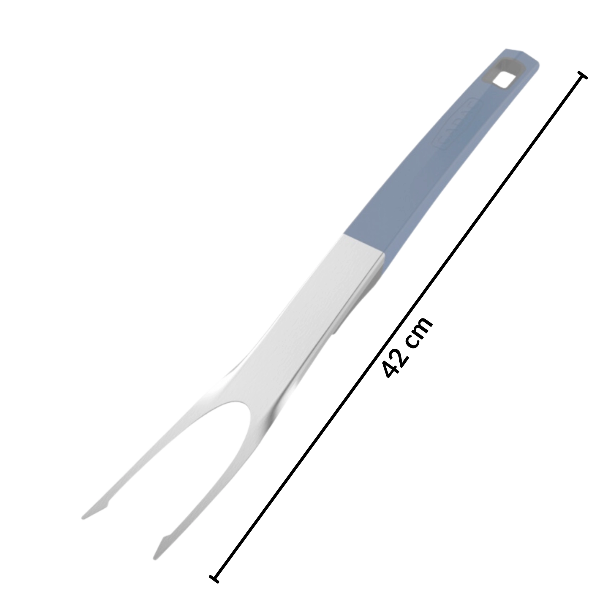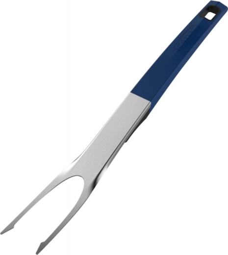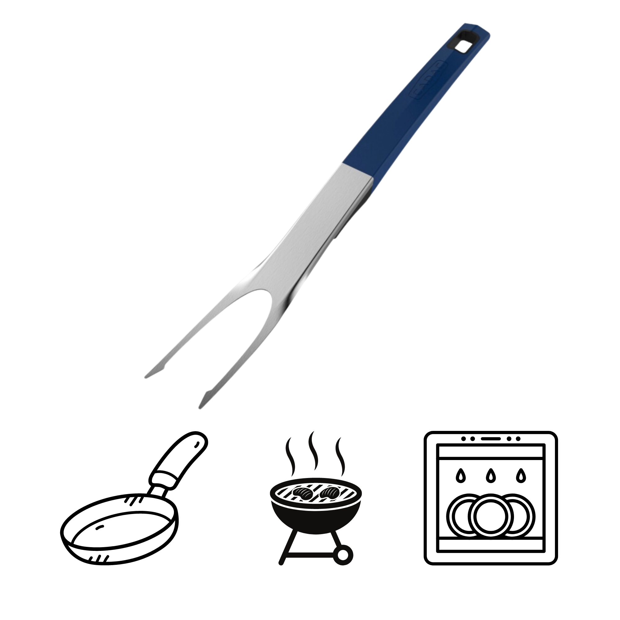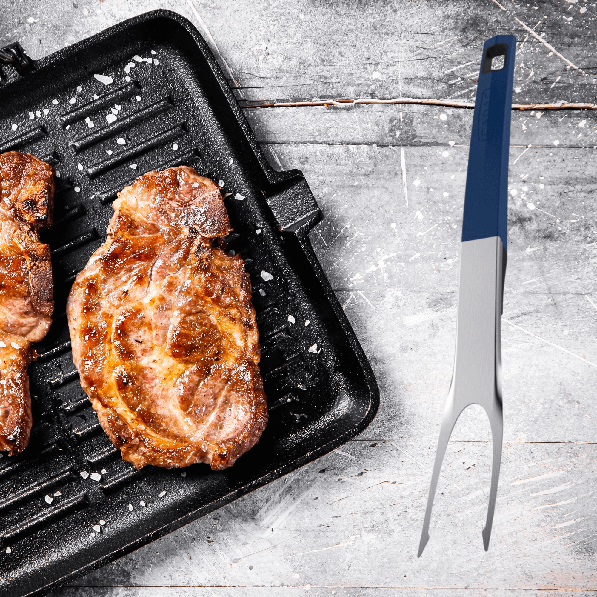Opdag en pålidelig hjælper til både grill og køkken. Den tohornede CADAC grillgaffel er lavet af robust, matbørstet rustfrit stål, som tåler høje temperaturer og hyppig brug. Det skridsikre silikonehåndtag i blå giver et behageligt og sikkert greb ved vending, isætning og servering.