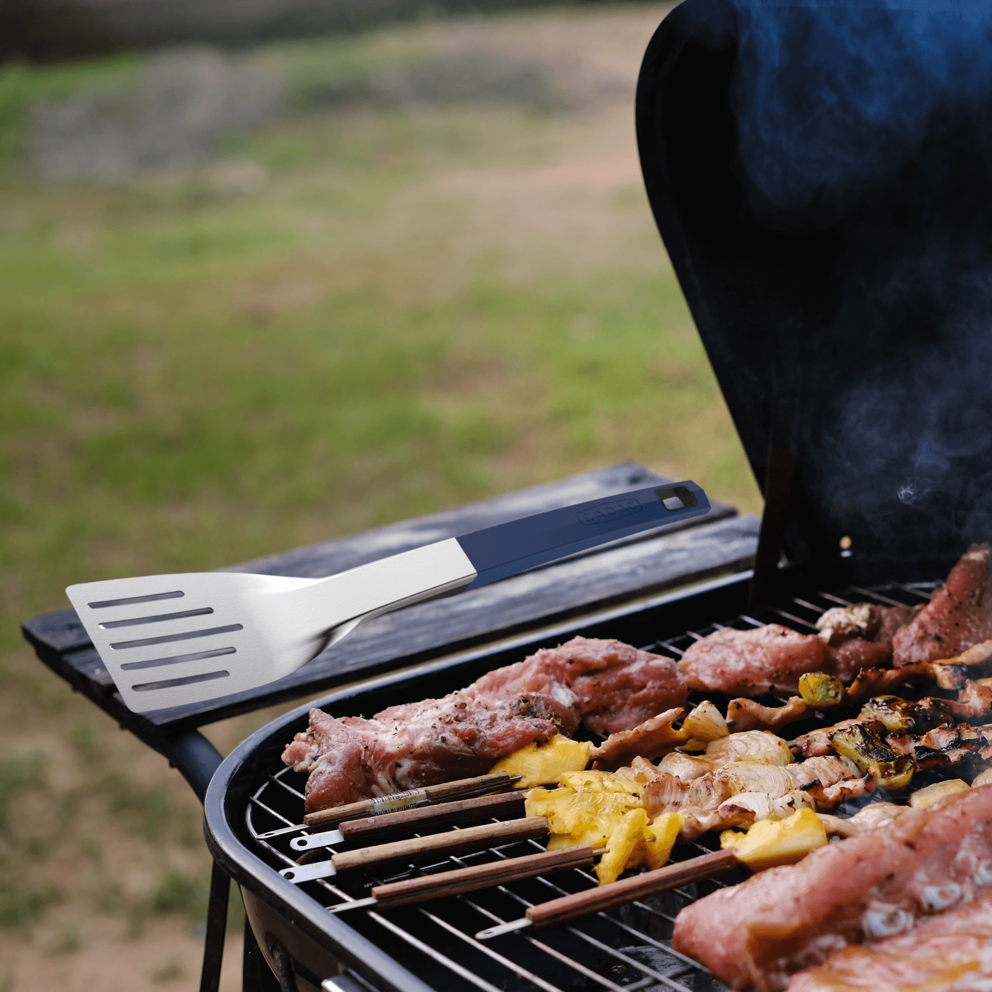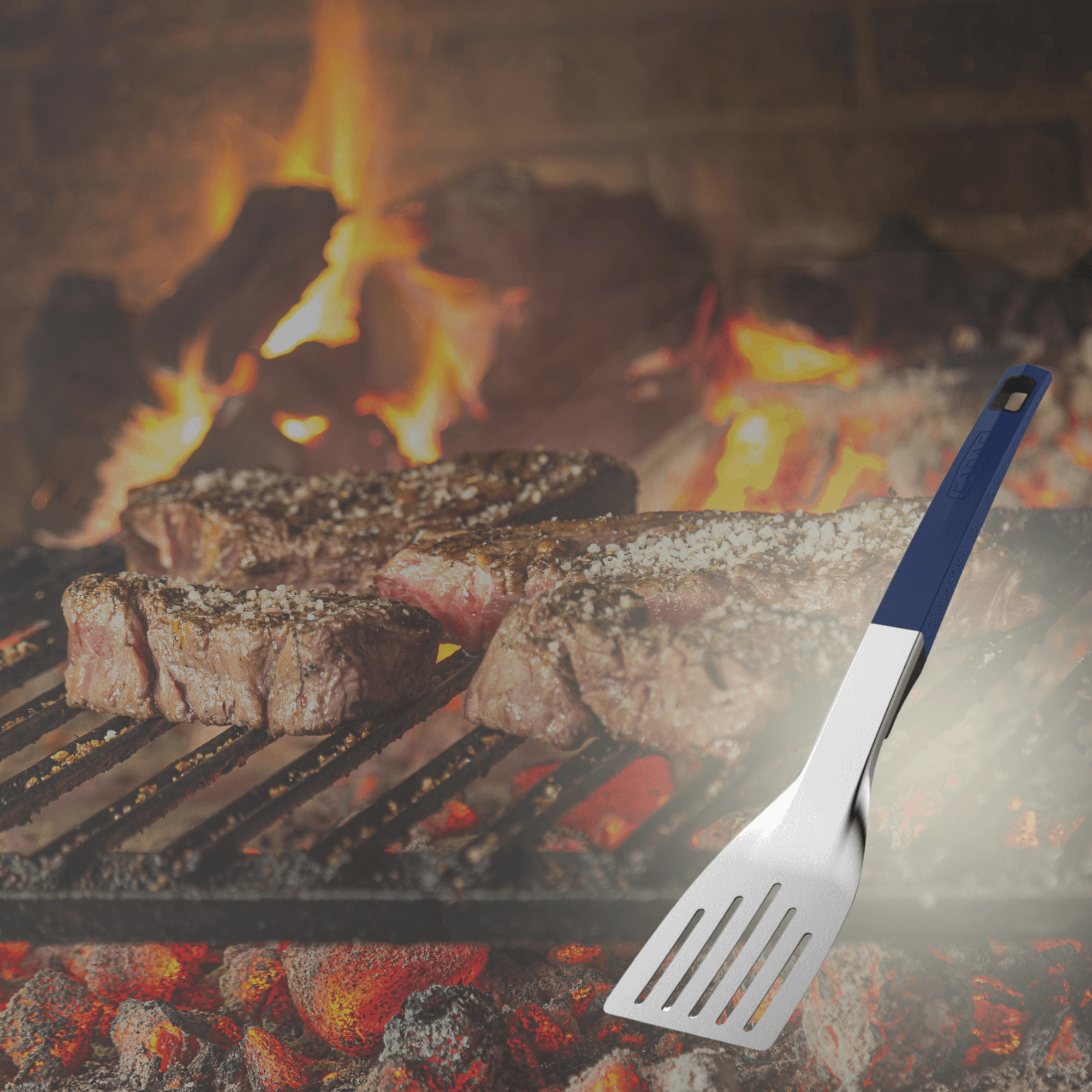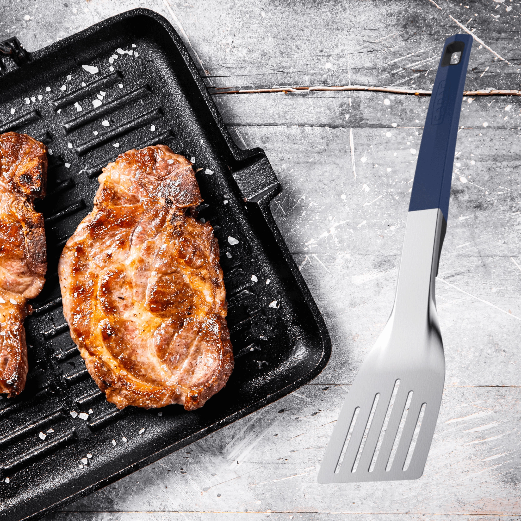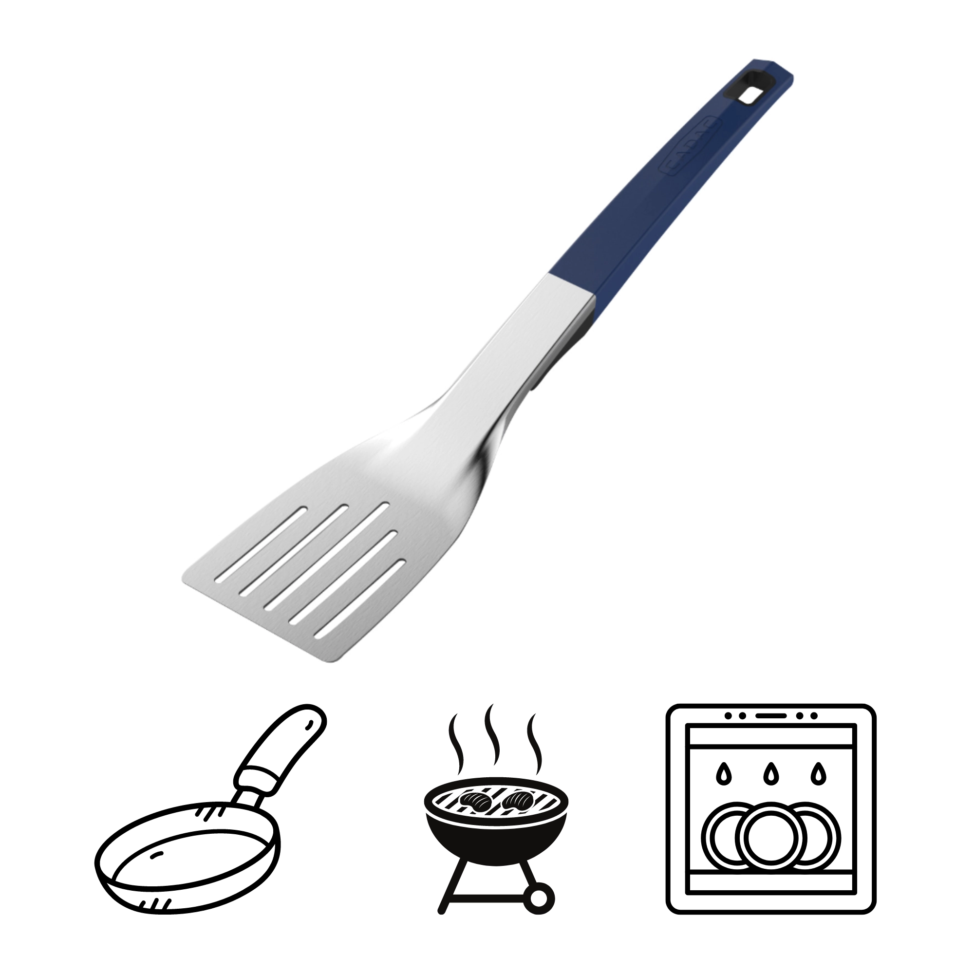 Den brede, perforerede klinge gør det effektivt at løfte og vende kød, grøntsager eller fisk, mens hullerne hjælper med at lede overskydende olie og safter væk. Efter brug kan den nemt vaskes i opvaskemaskinen og hænges op i det praktiske hul.