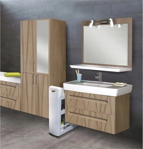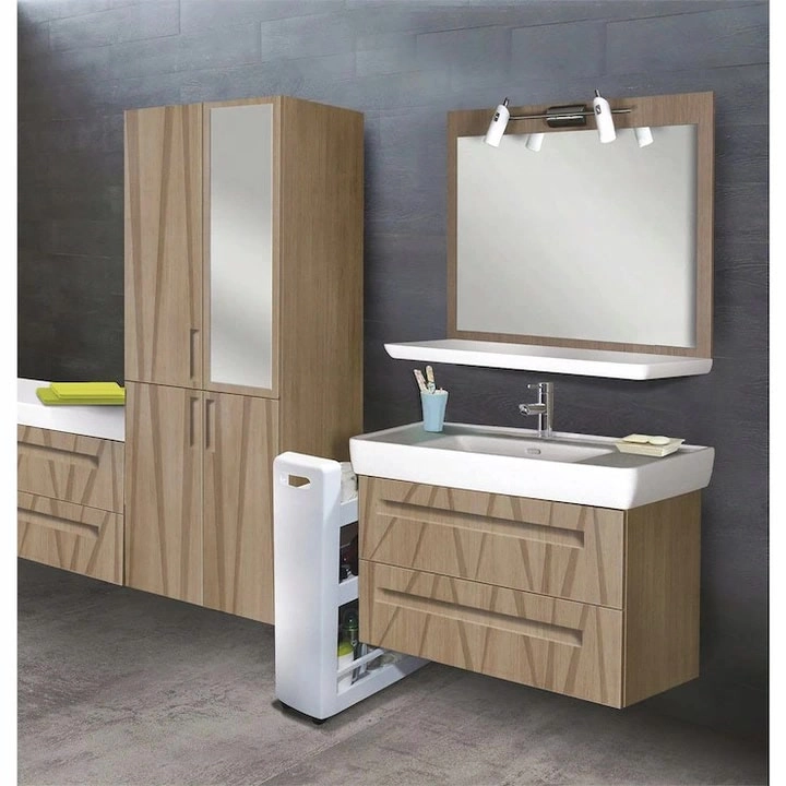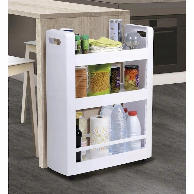 Dette slanke opbevaringsskab på hjul er ideelt til at udnytte døde mellemrum mellem møbler, ved siden af køkkenbordet eller under bordpladen op til en højde på 80 cm. De brede hylder kan rumme side om side to 1,5 l flasker, kosmetik, rengøringsmidler, beholdere, krydderier og kogebøger.