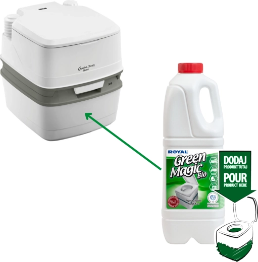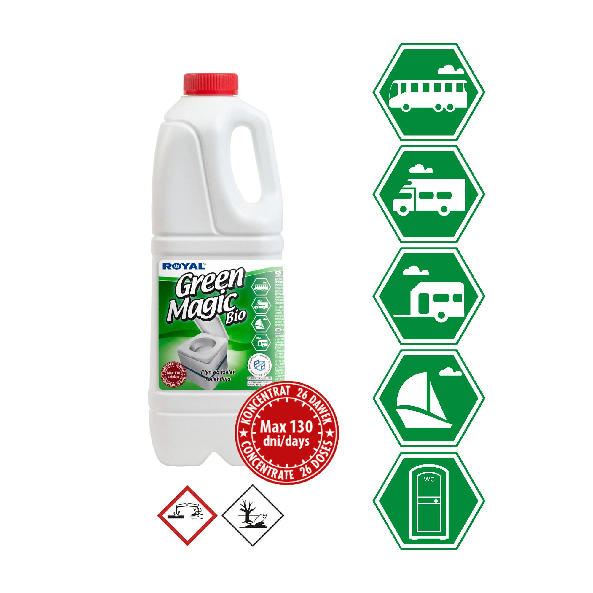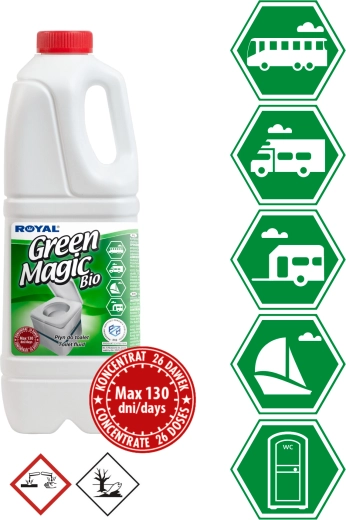 GREEN MAGIC BIO er en pålidelig koncentrat beregnet til den nederste affaldstank i transportable og kassettetoiletter. Takket være den stærke formulering letter den tømning af tanken, forhindrer gasdannelse og hjælper med at holde toilettet hygiejnisk rent selv ved intensiv brug på rejser eller byggepladser.