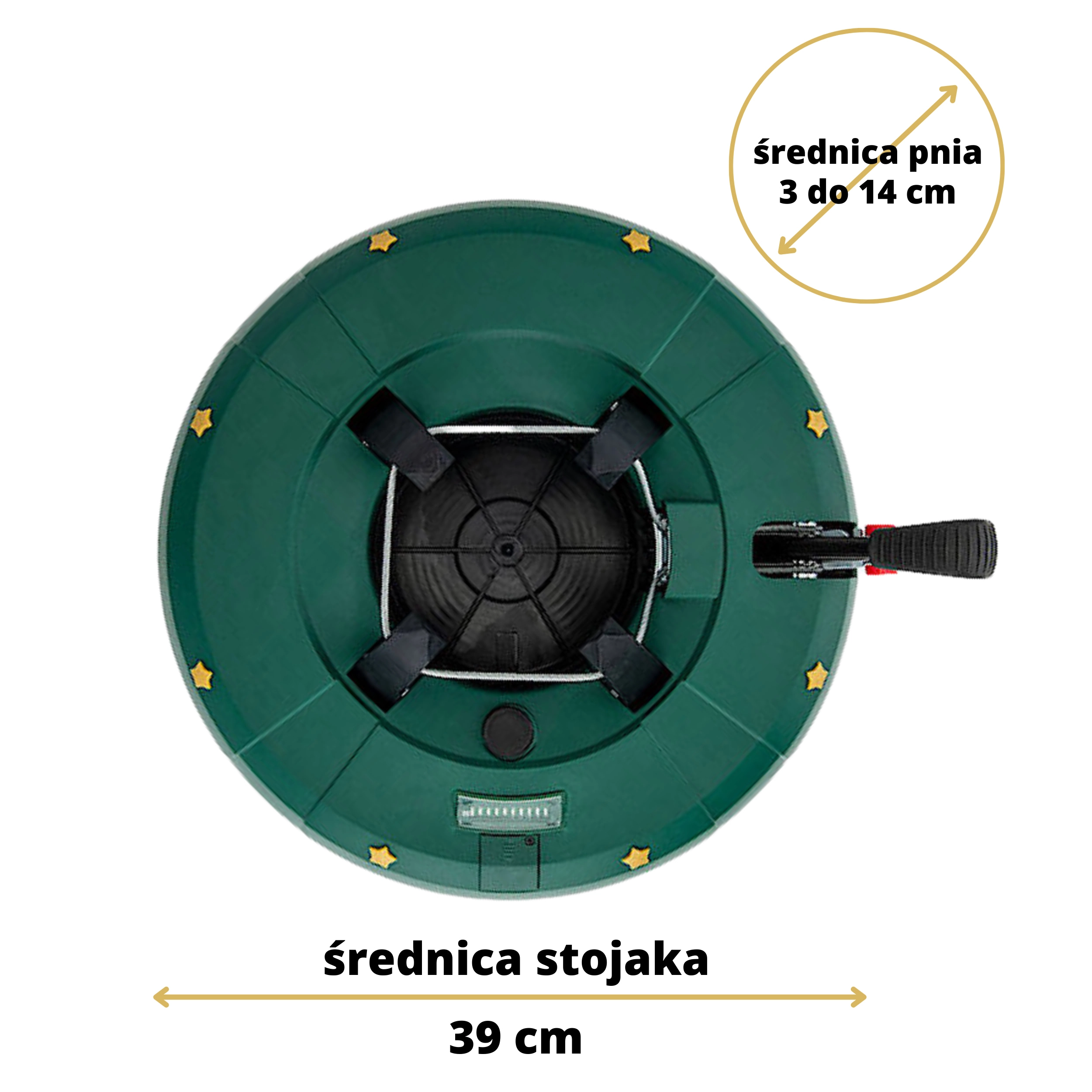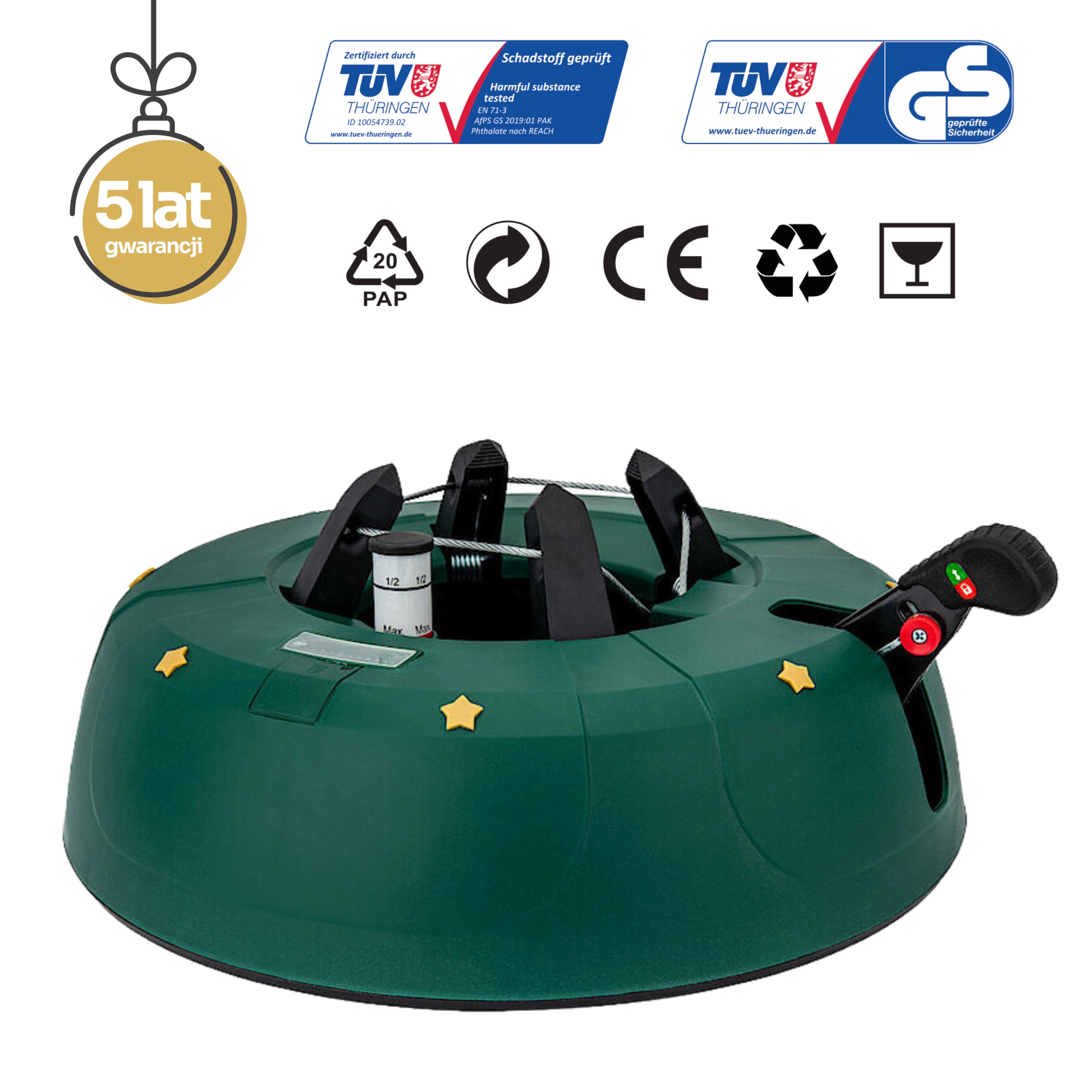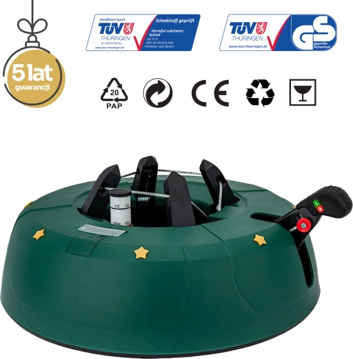 Foden er designet til almindelige typer levende træer, der sælges i EU – gran, ædelgran og fyr. Det grønne design med gyldne stjerner passer diskret til julepynten, og takket være håndtagslåsen er brugen sikker i travle hjem, hoteller og butikker.