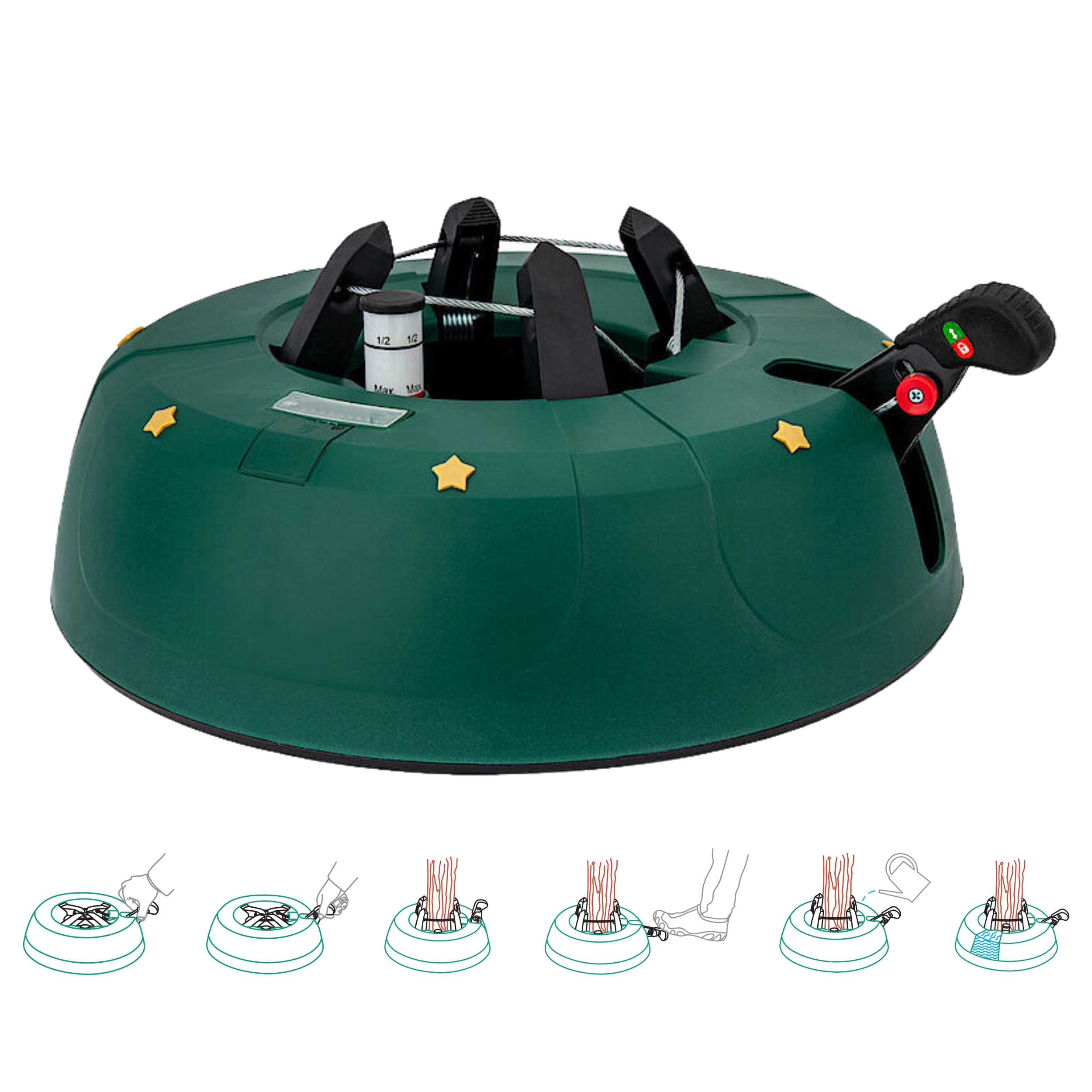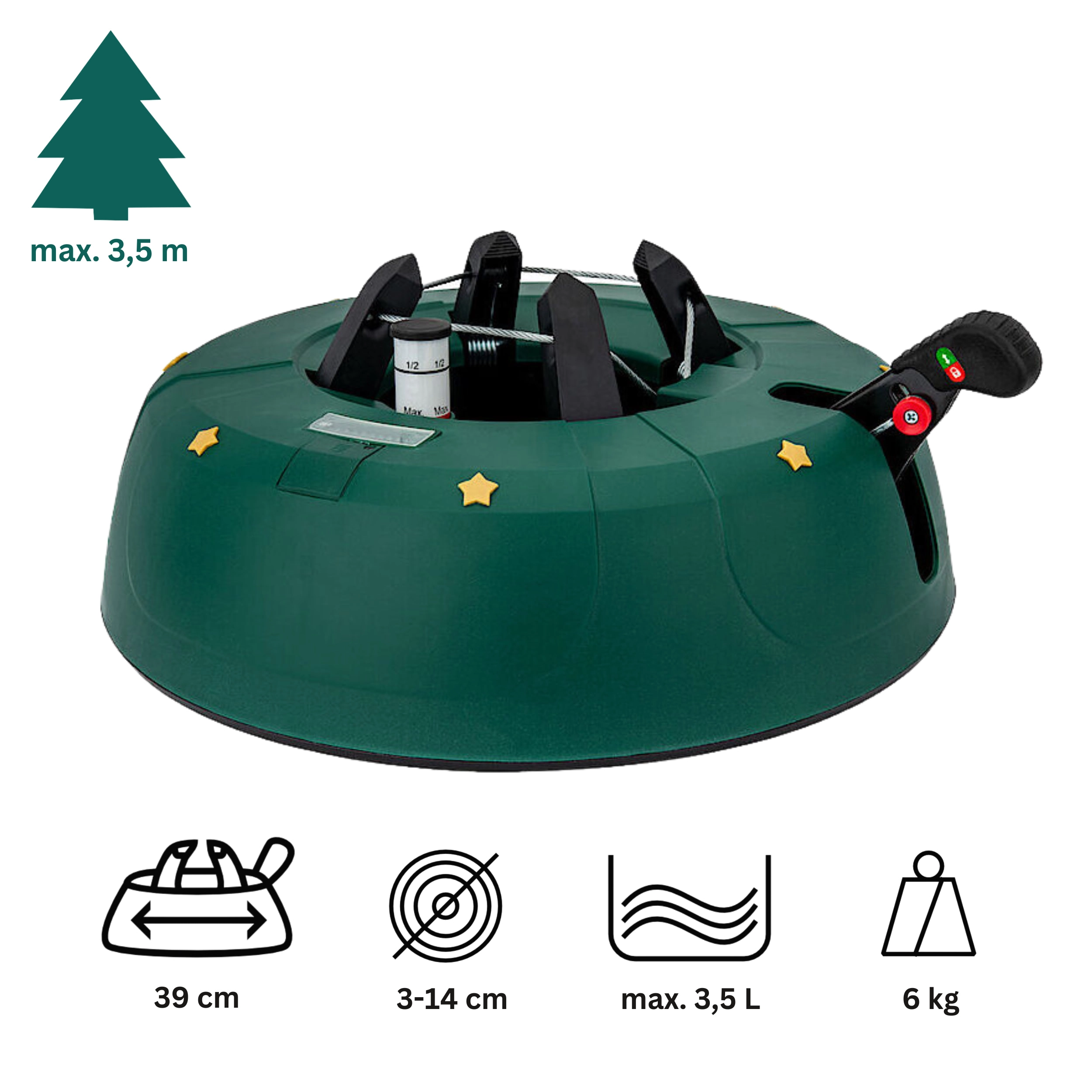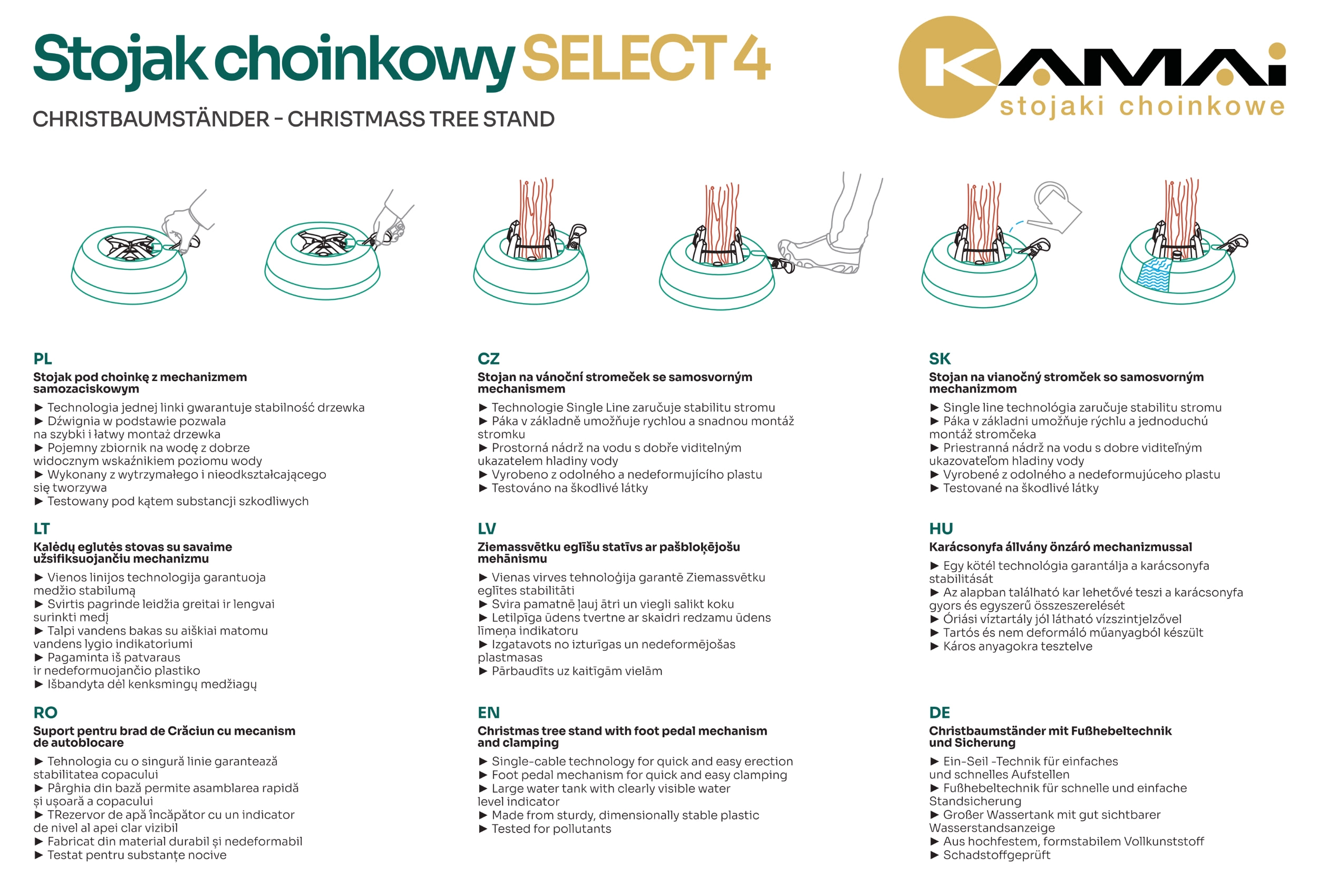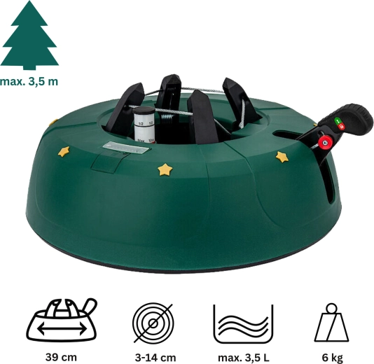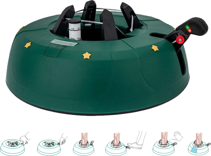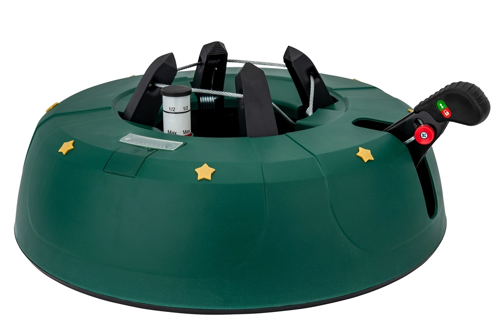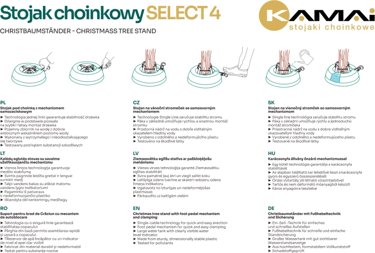 Den robuste juletræsfod Kamai Select 4 sikrer maksimal stabilitet og nem installation af træer op til en højde på 3,5 m. Den har en integreret vandbeholder på 3,5 l med niveauindikator, en stålwiremekanisme og 4 automatiske kroge, som griber stammen fast. En sikker låsehåndtag forhindrer utilsigtet frigivelse.